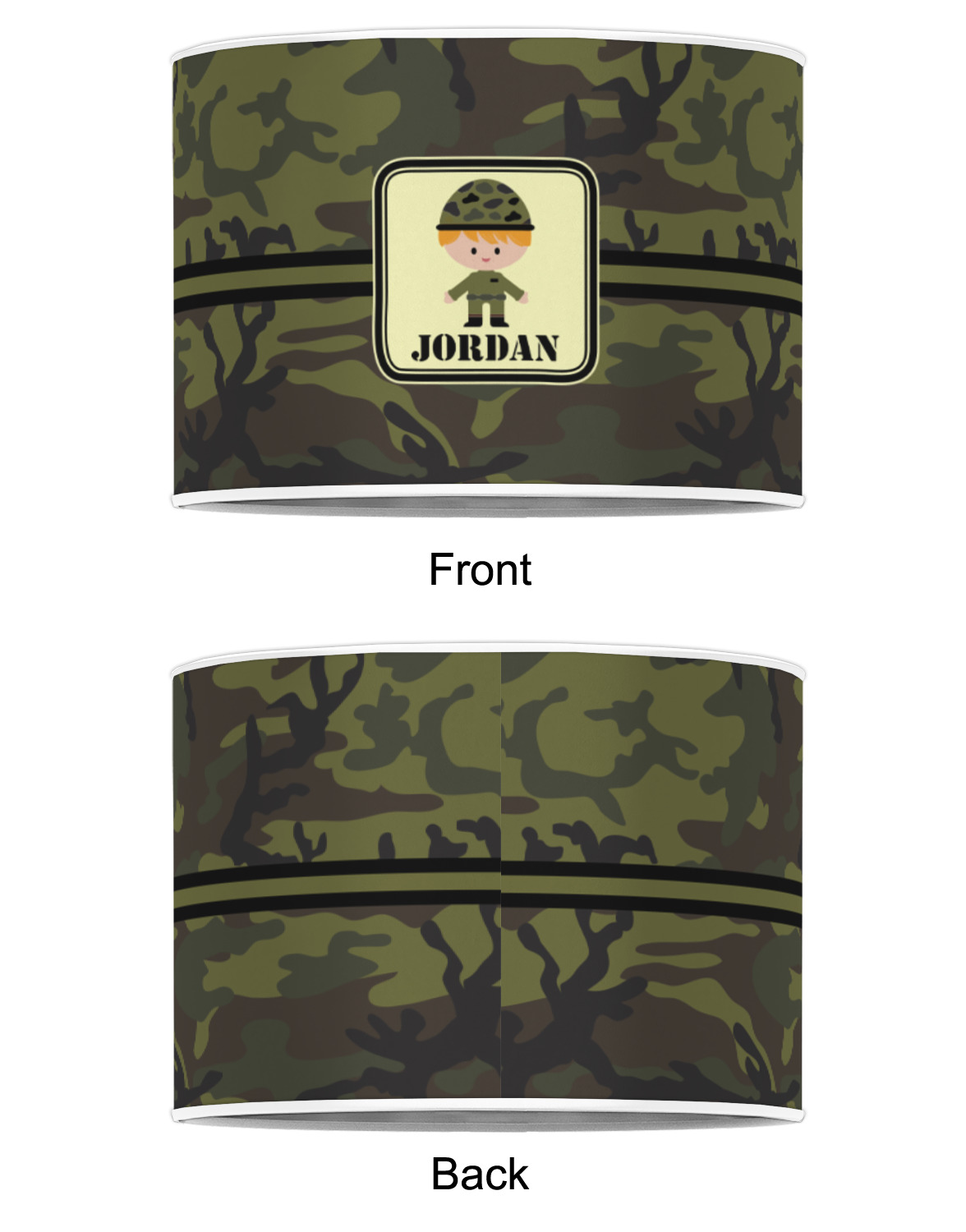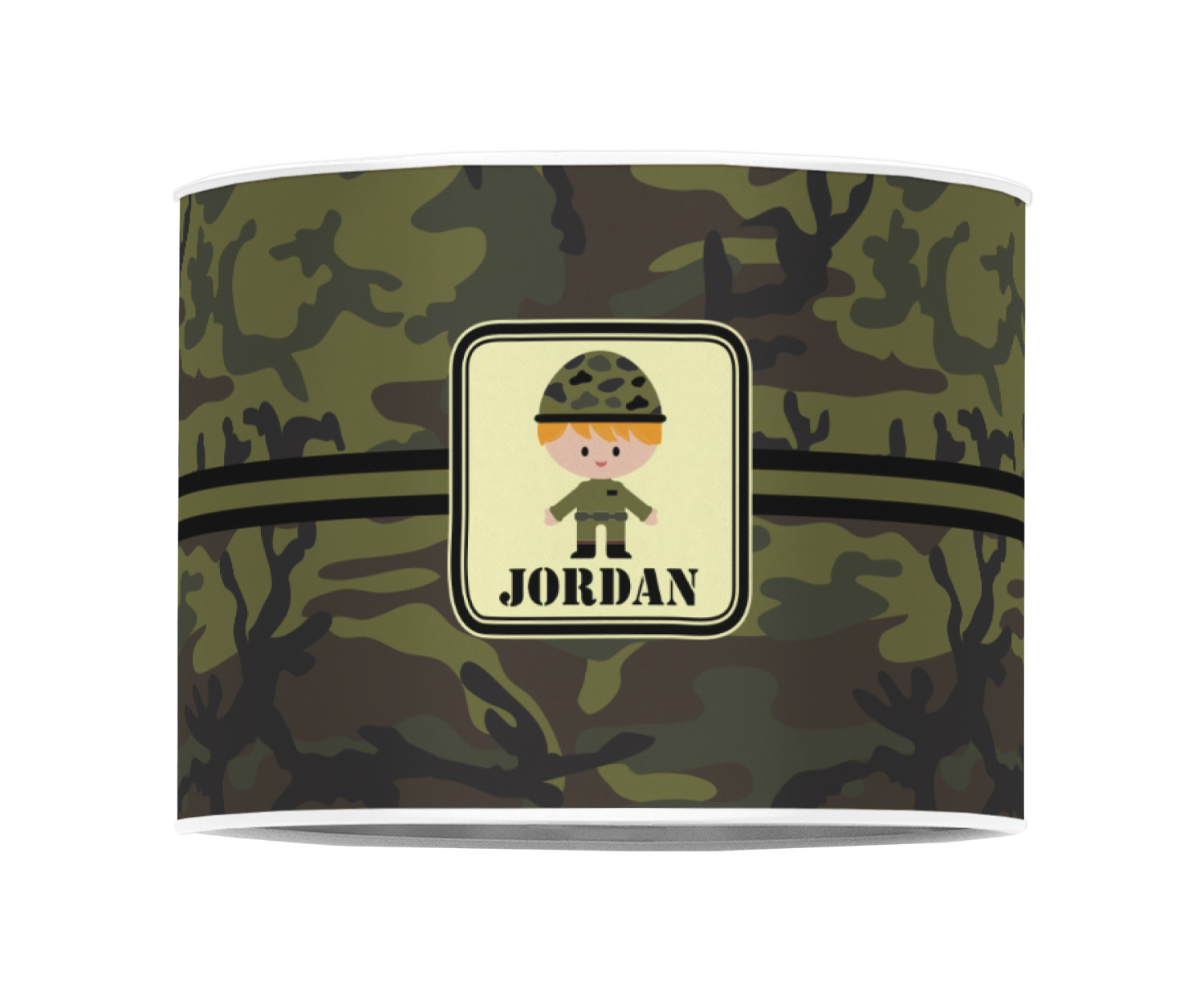 A wide band using coordinating colors runs down the middle of this design. A square label, outlined with camo colors, showcases our little military man with added personalization for the special touch.