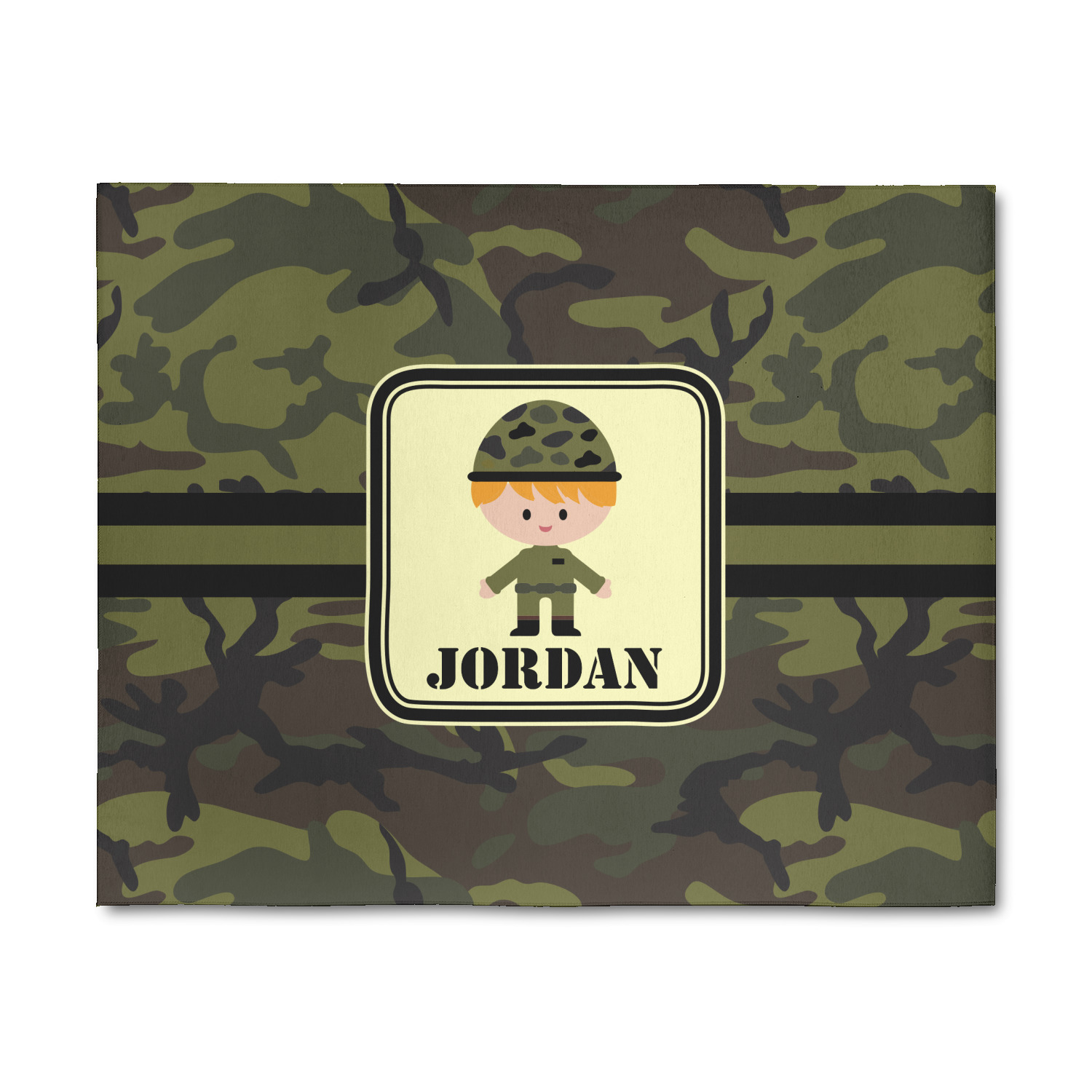 A wide band using coordinating colors runs down the middle of this design. A square label, outlined with camo colors, showcases our little military man with added personalization for the special touch.