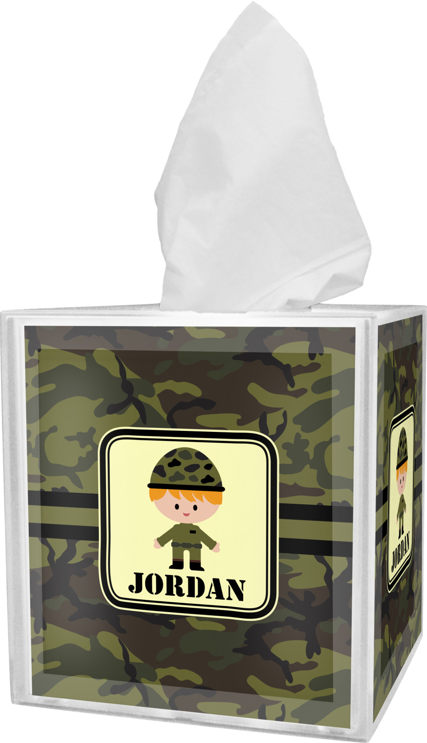 These tissue holders are built from durable acrylic and display your unique personalization on fine-quality vinyl inserts placed within the four sides and top. The box features two pieces, allowing you to easily switch out tissue boxes. On the sides, you'll find ridges that ensure the top and base fit securely in place. The bottom of these tissue box holders has four, rubber, non-slip pads to prevent the box from scuffing any surface you decide to display it on. Each box can fit a standard 5-by-5-inch box of tissues.