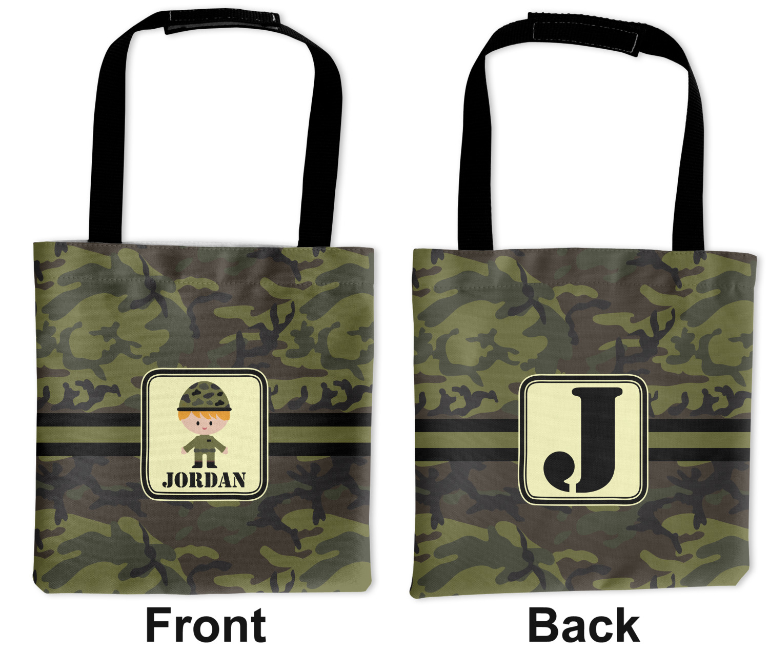 A wide band using coordinating colors runs down the middle of this design. A square label, outlined with camo colors, showcases our little military man with added personalization for the special touch.