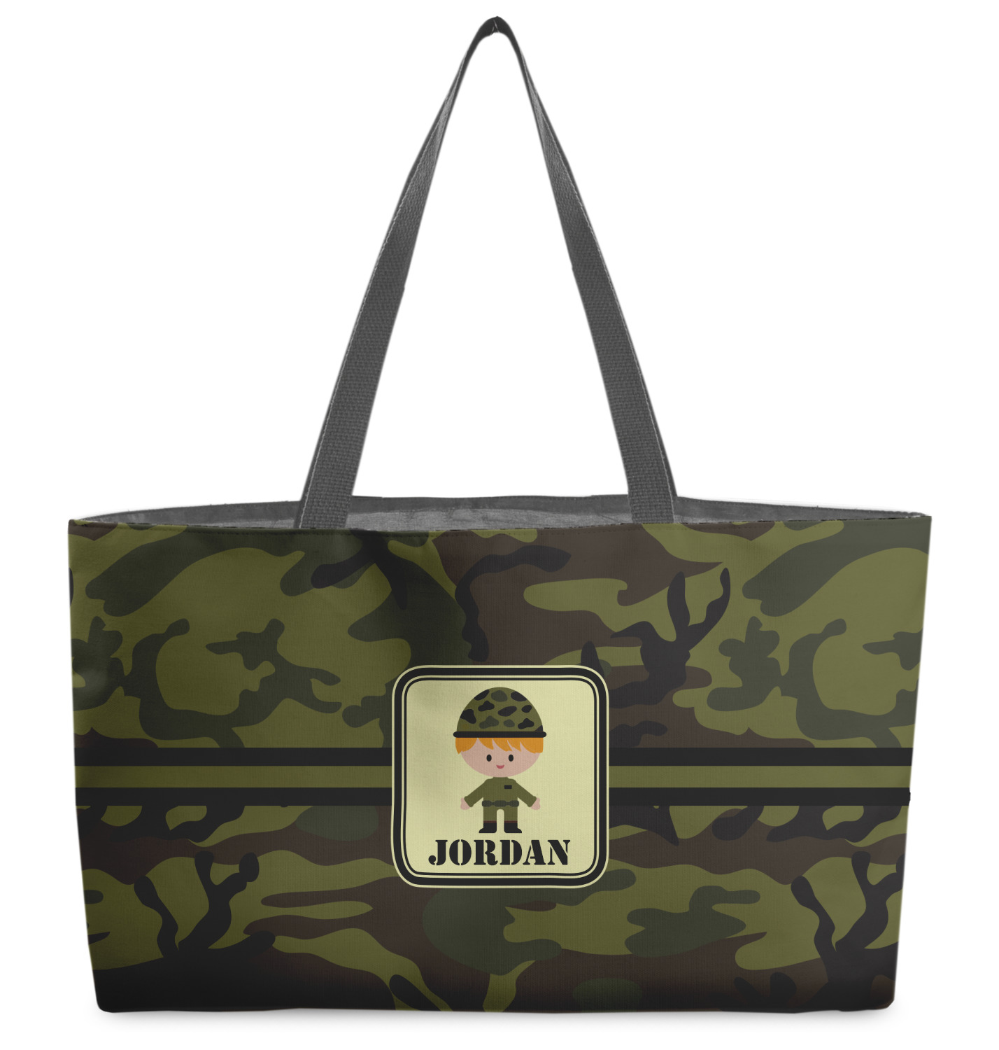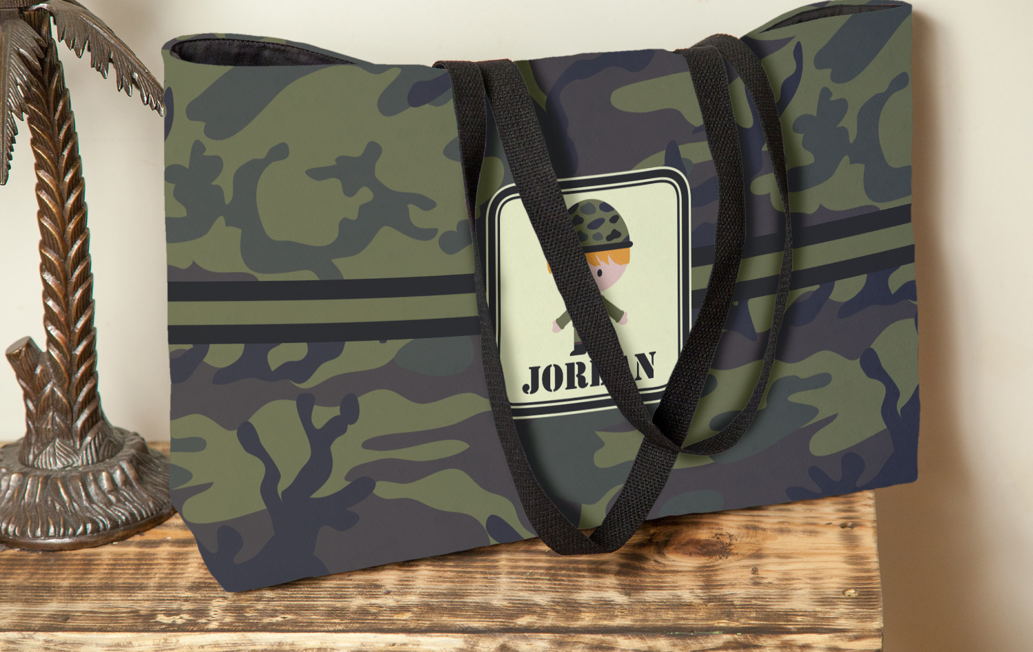 A wide band using coordinating colors runs down the middle of this design. A square label, outlined with camo colors, showcases our little military man with added personalization for the special touch.