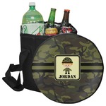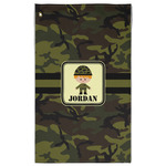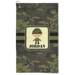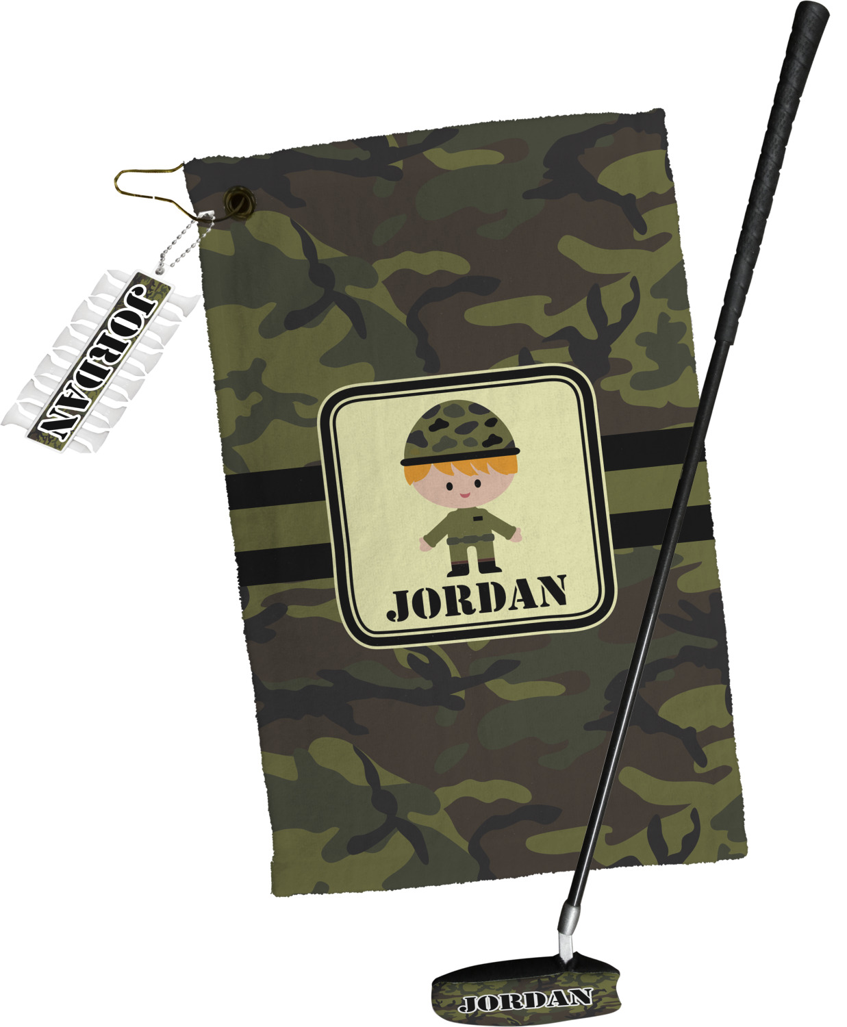 A wide band using coordinating colors runs down the middle of this design. A square label, outlined with camo colors, showcases our little military man with added personalization for the special touch.