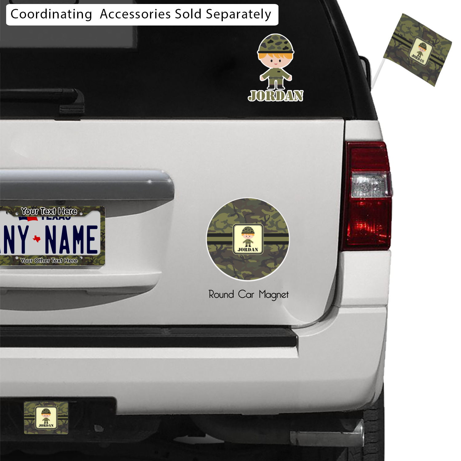 A wide band using coordinating colors runs down the middle of this design. A square label, outlined with camo colors, showcases our little military man with added personalization for the special touch.