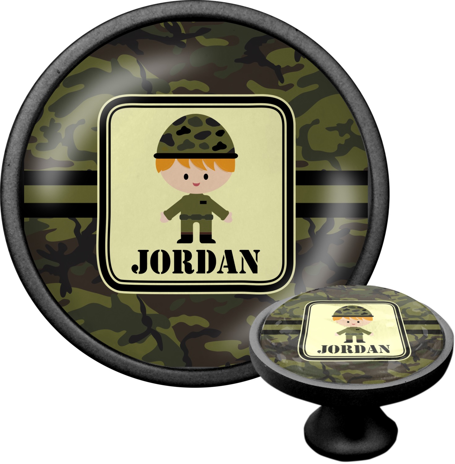 A wide band using coordinating colors runs down the middle of this design. A square label, outlined with camo colors, showcases our little military man with added personalization for the special touch.