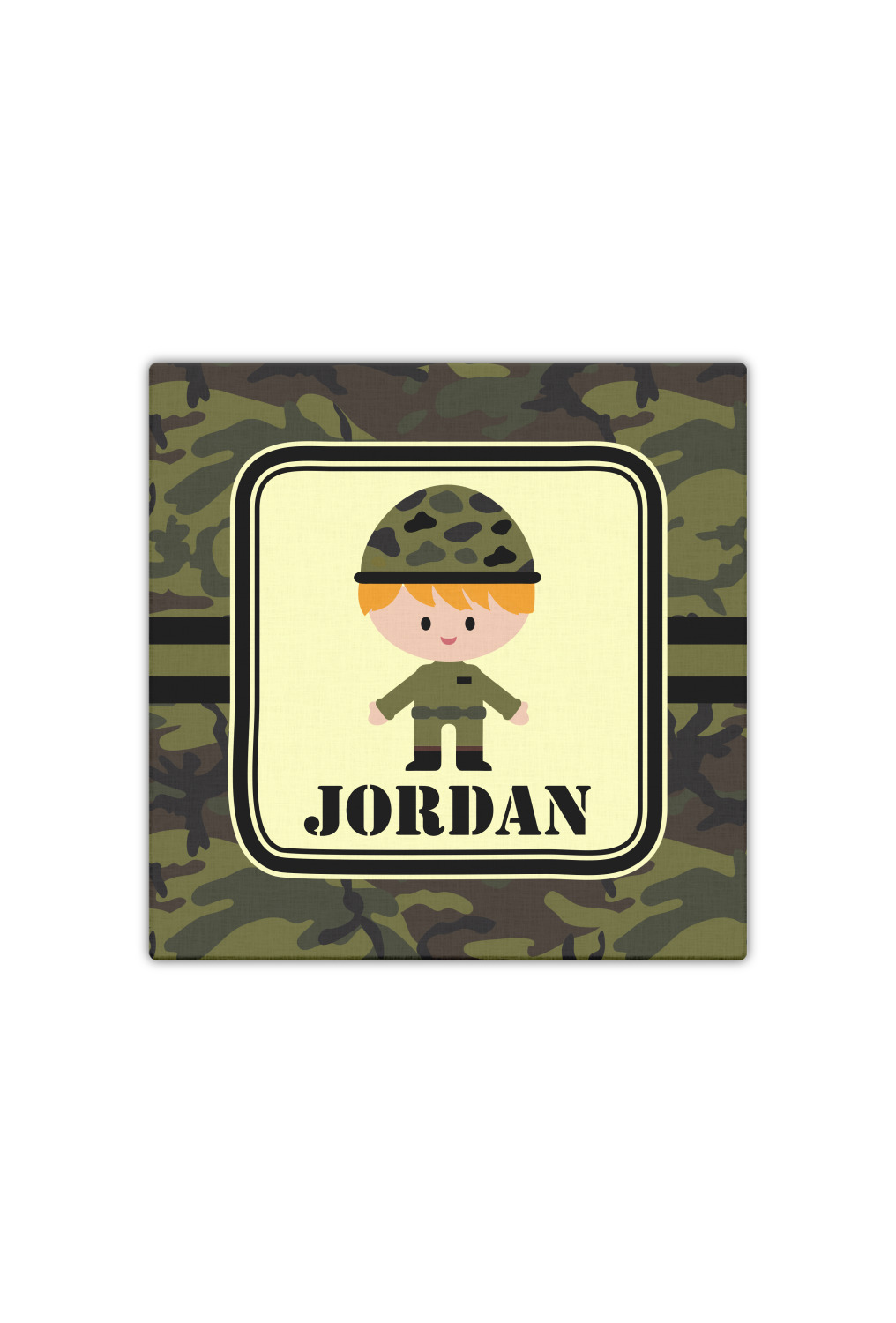 A wide band using coordinating colors runs down the middle of this design. A square label, outlined with camo colors, showcases our little military man with added personalization for the special touch.