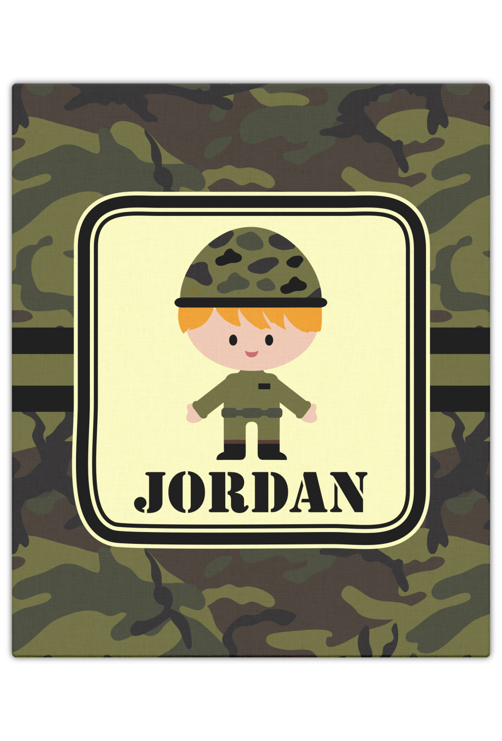 A wide band using coordinating colors runs down the middle of this design. A square label, outlined with camo colors, showcases our little military man with added personalization for the special touch.
