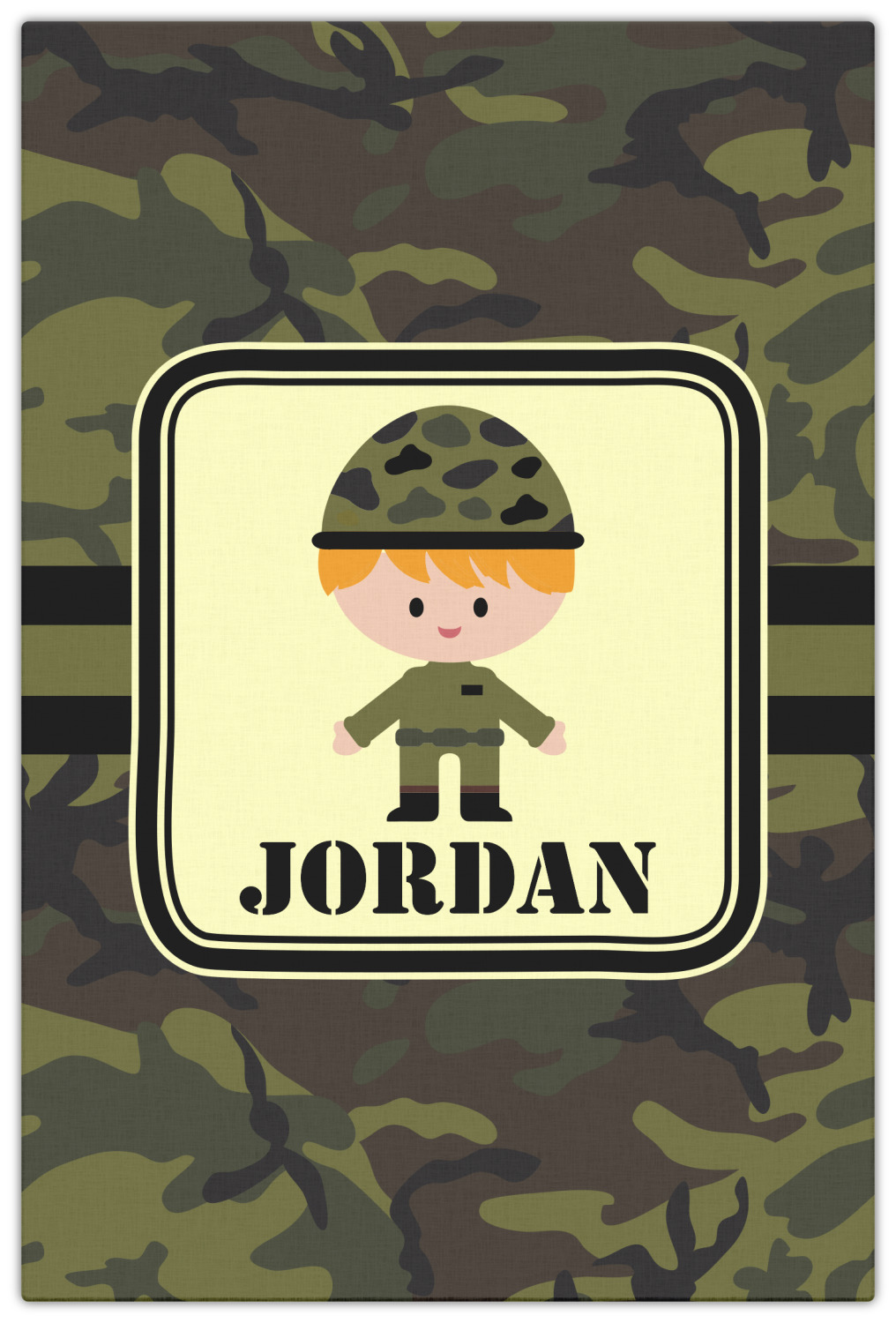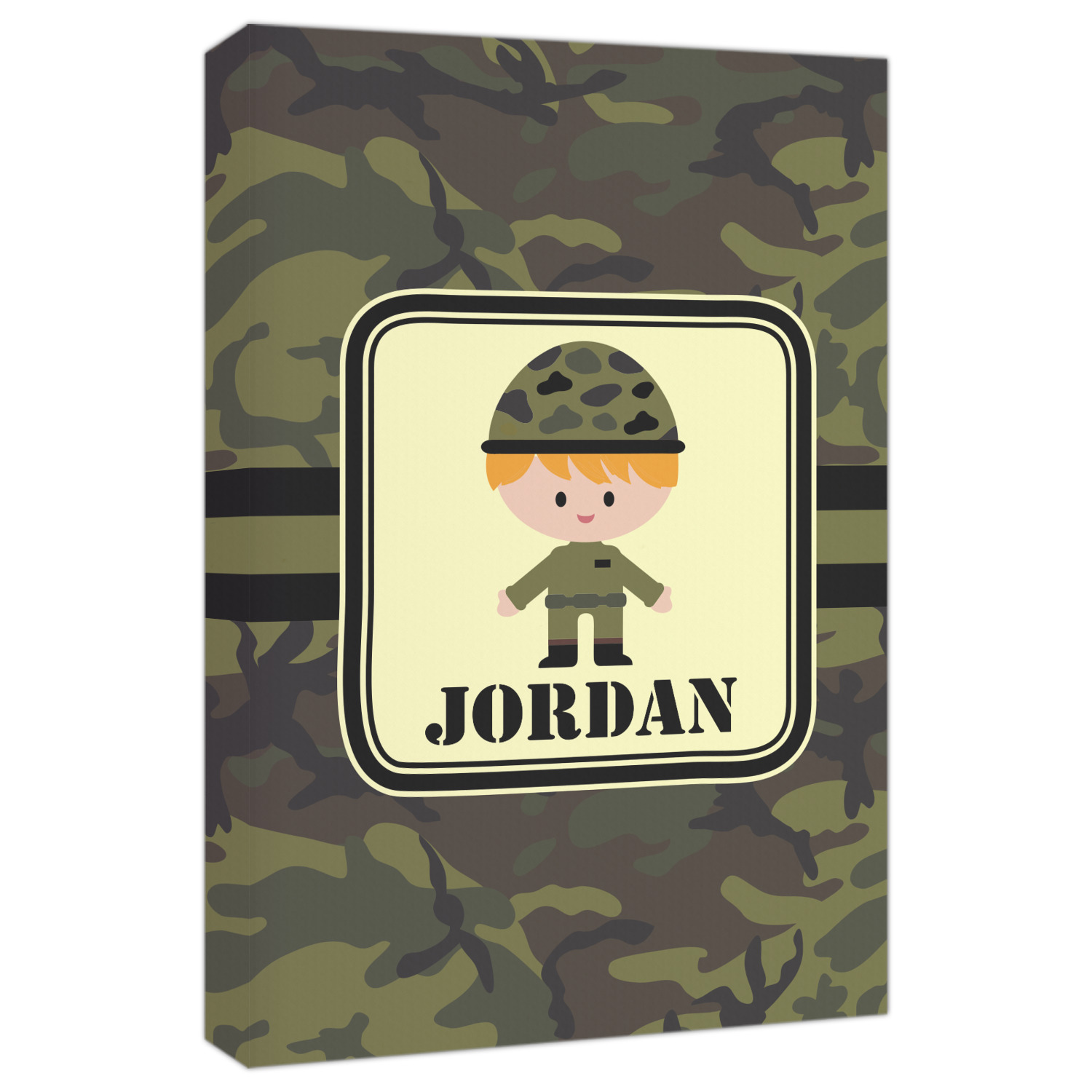 A wide band using coordinating colors runs down the middle of this design. A square label, outlined with camo colors, showcases our little military man with added personalization for the special touch.