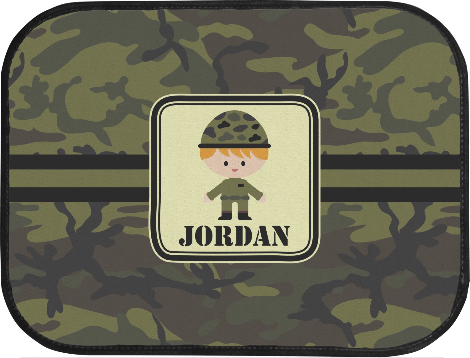 A wide band using coordinating colors runs down the middle of this design. A square label, outlined with camo colors, showcases our little military man with added personalization for the special touch.