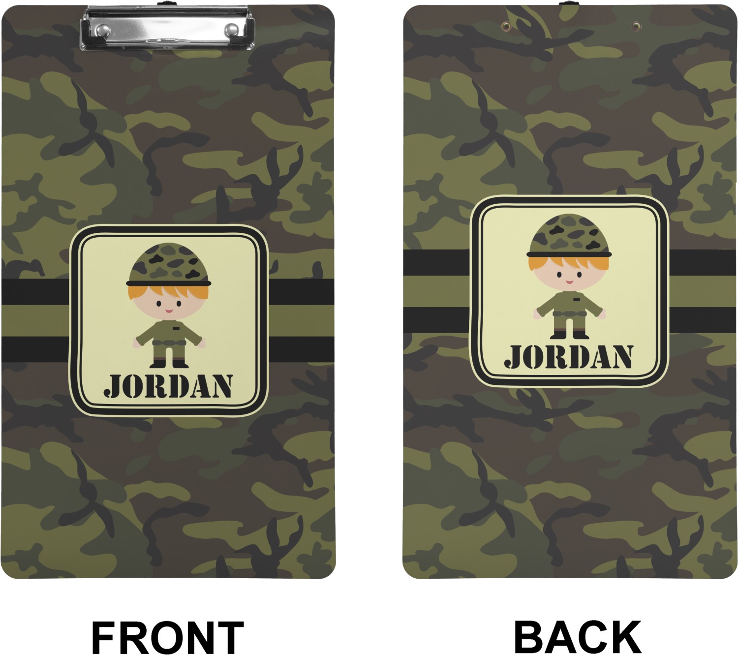 A wide band using coordinating colors runs down the middle of this design. A square label, outlined with camo colors, showcases our little military man with added personalization for the special touch.