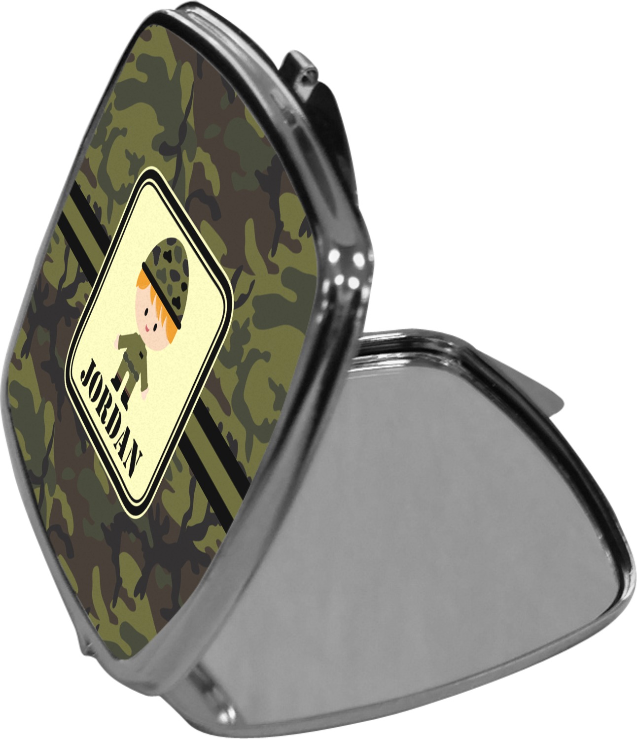 Our compact mirrors are customized with your design on one side. The other side is patterned silver tone metal. Inside, there are two mirrors.
