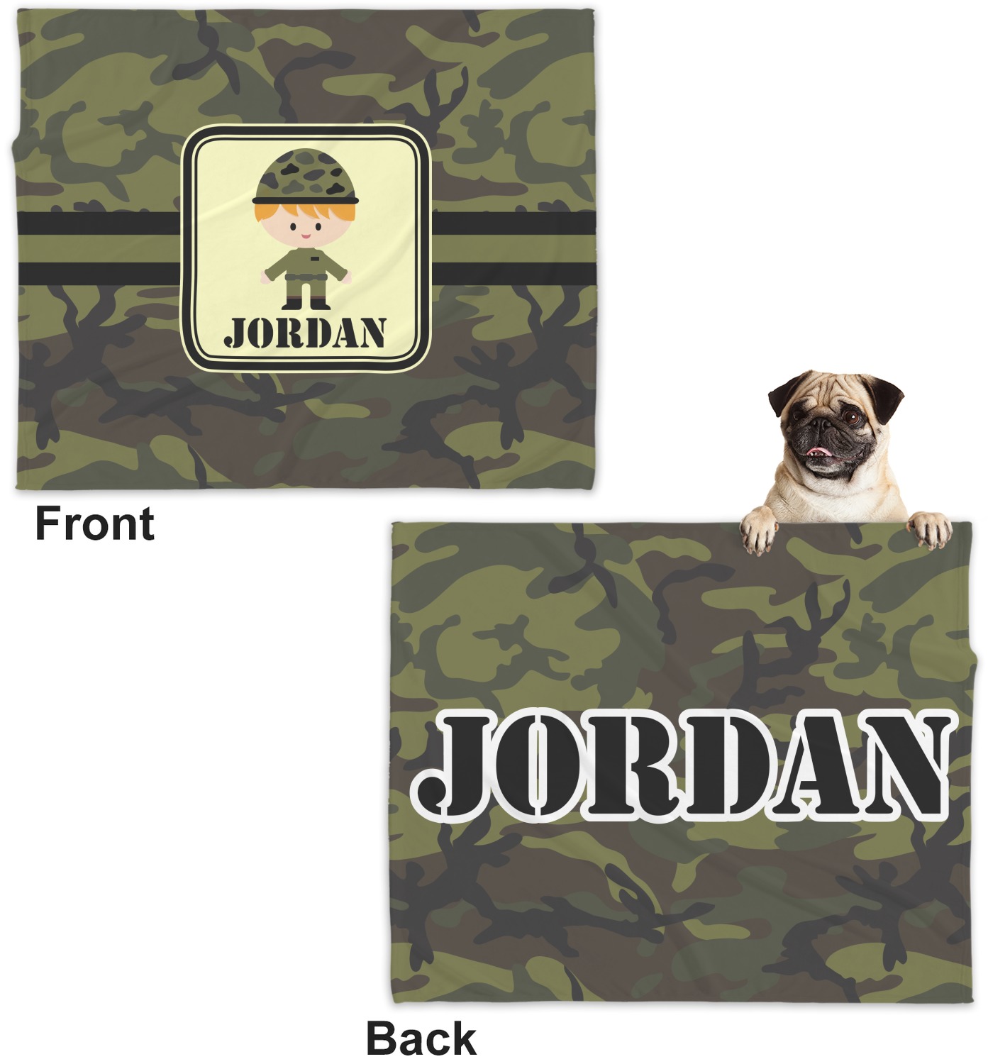 These dog blankets are crafted from a gentle, soft-to-the-touch, minky material. We print your customizations, either matching or differing, on both the top and underside of the blanket. These personalized dog blankets are available in two sizes: regular and large. Our regular size, at 40" x 30", accommodates small and some medium size dogs. At 60" x 50", our large dog blanket is a better fit for bigger breeds. Though specialized for dogs, these blankets still make a thoughtful gift for your favorite feline, or any other pet in mind!