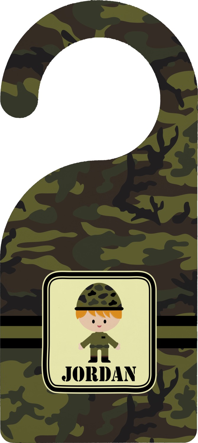 A wide band using coordinating colors runs down the middle of this design. A square label, outlined with camo colors, showcases our little military man with added personalization for the special touch.