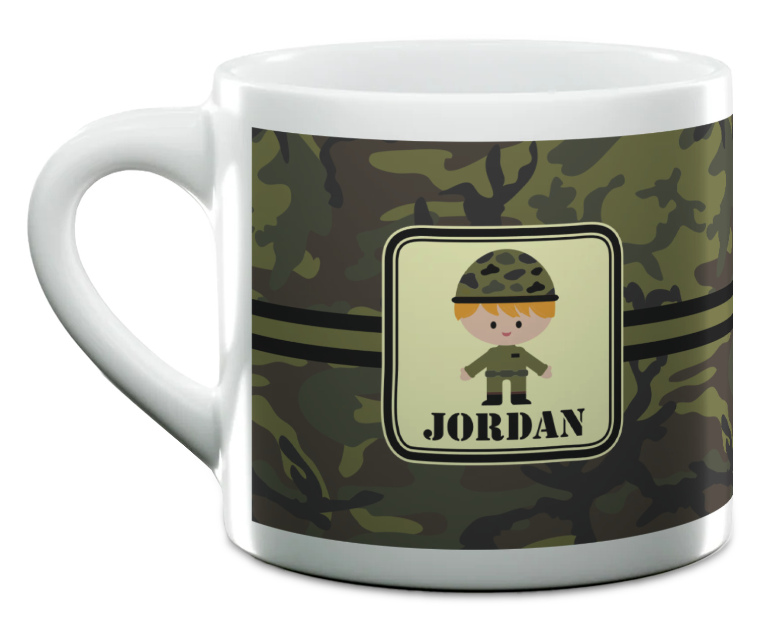 Each of our espresso mugs is a ceramic material sure to keep your drink warm. Personalize one cup for yourself, or order a set of 4! Its the perfect little gift for any coffee lover! We carry two sizes for you to personalize - 3 oz. (approx. 3.25" x 2.325" x 2.625") or 6 oz. (approx. 4" x 2.9" x 2.9"). Our 3 oz. mug is perfect for that single shot espresso while our 6 oz. mug can be your next favorite cappuccino cup holding two shots of espresso!