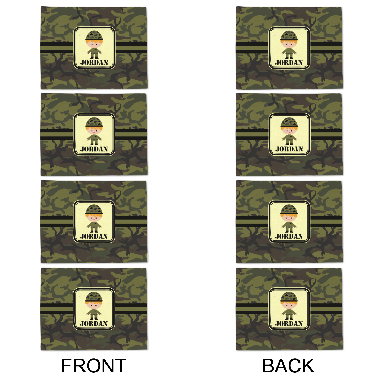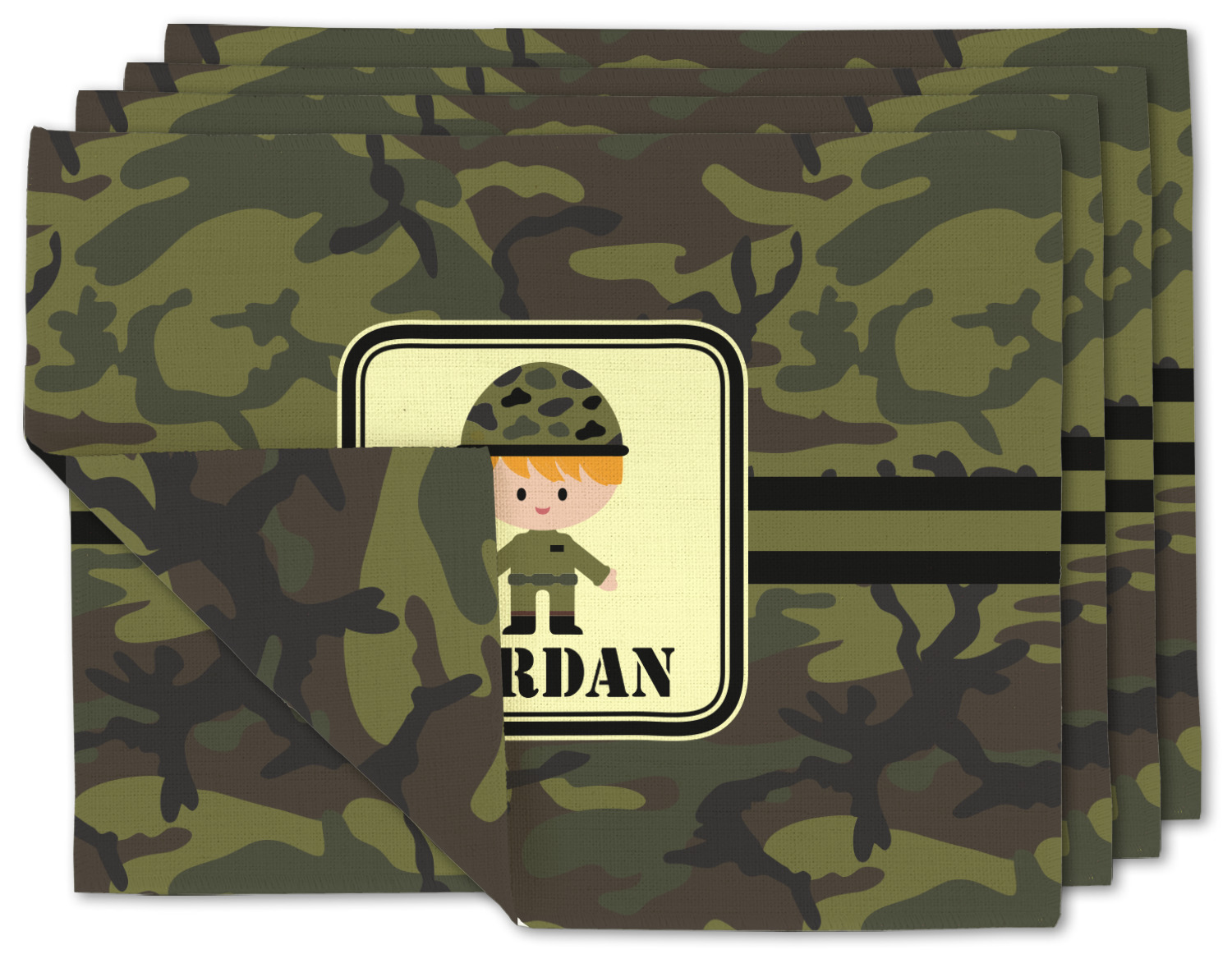 A wide band using coordinating colors runs down the middle of this design. A square label, outlined with camo colors, showcases our little military man with added personalization for the special touch.
