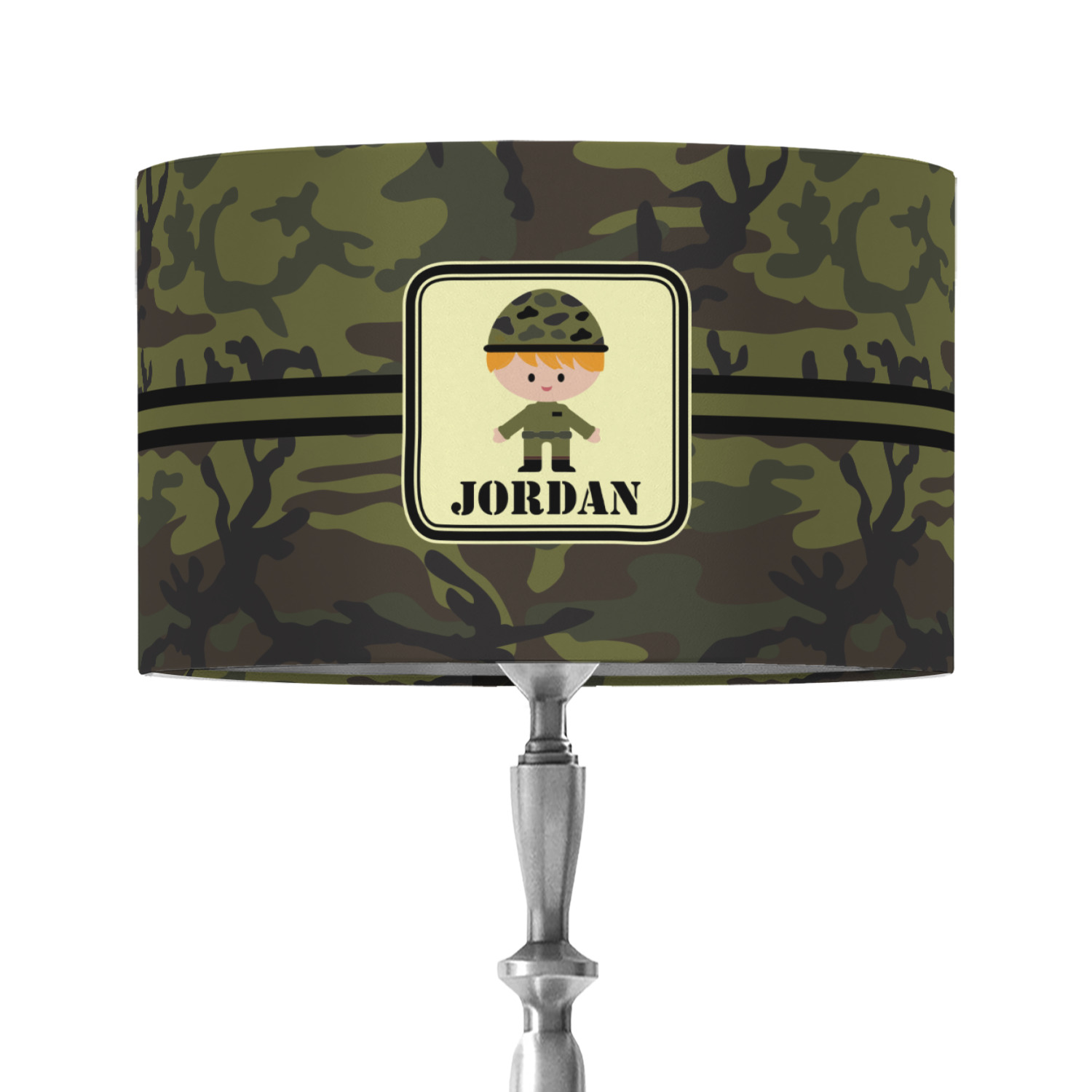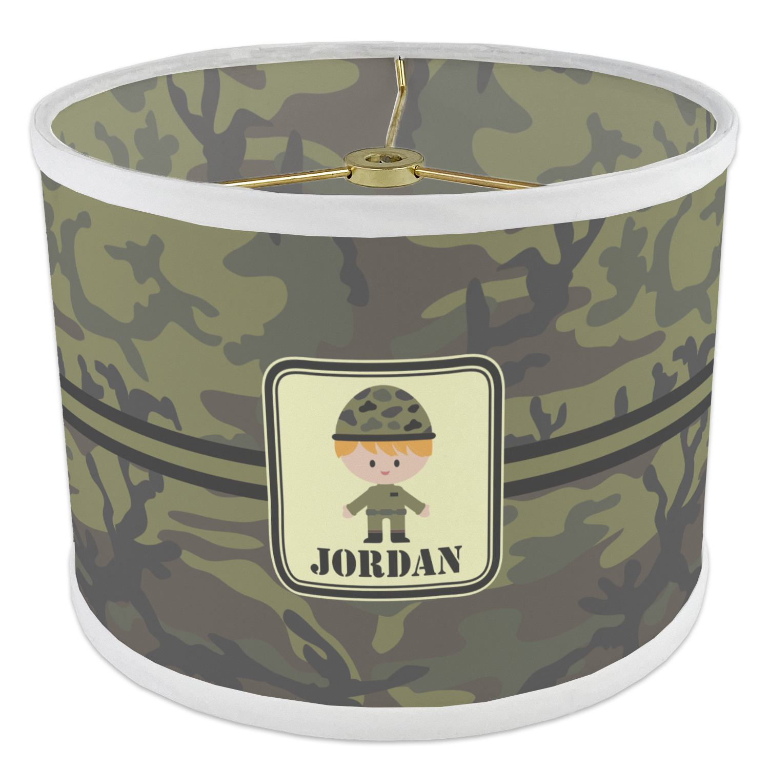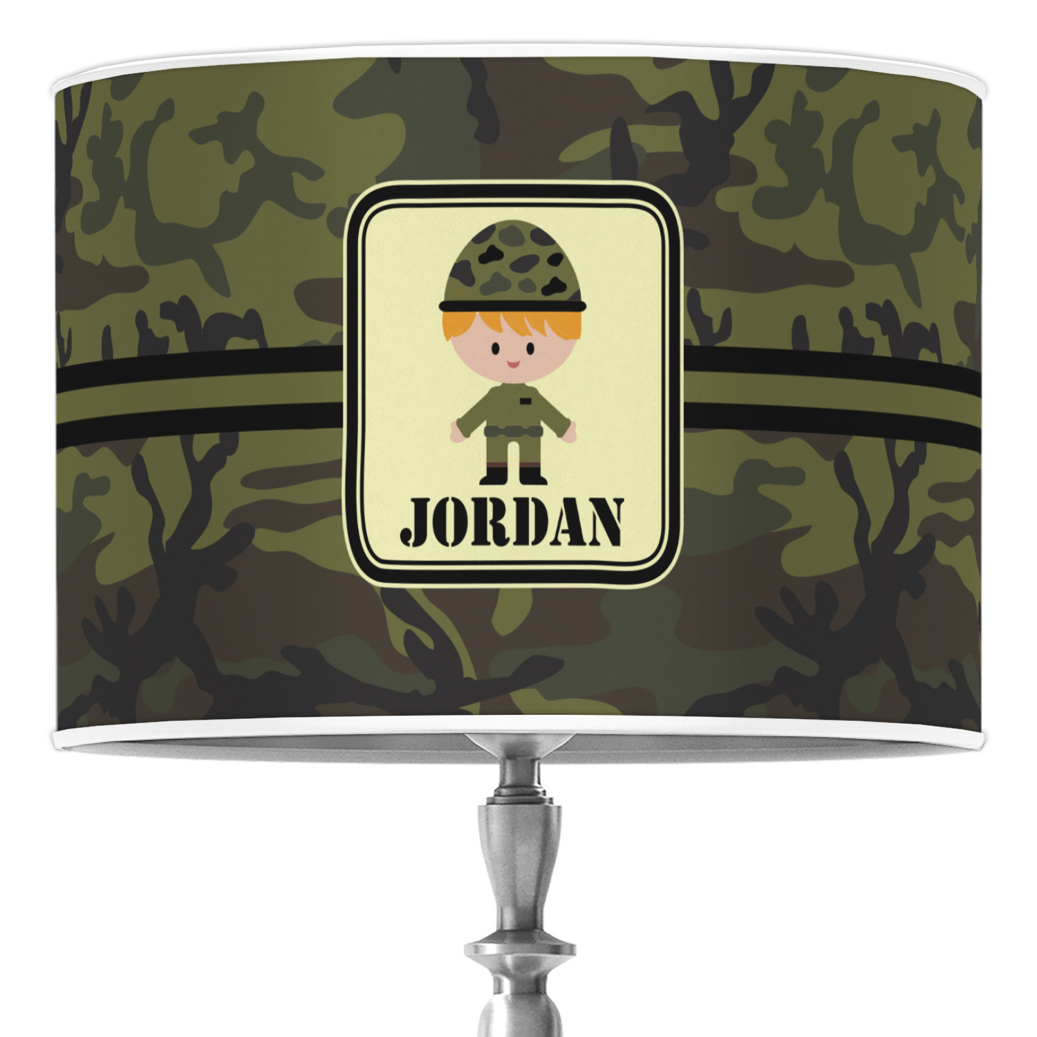 A wide band using coordinating colors runs down the middle of this design. A square label, outlined with camo colors, showcases our little military man with added personalization for the special touch.