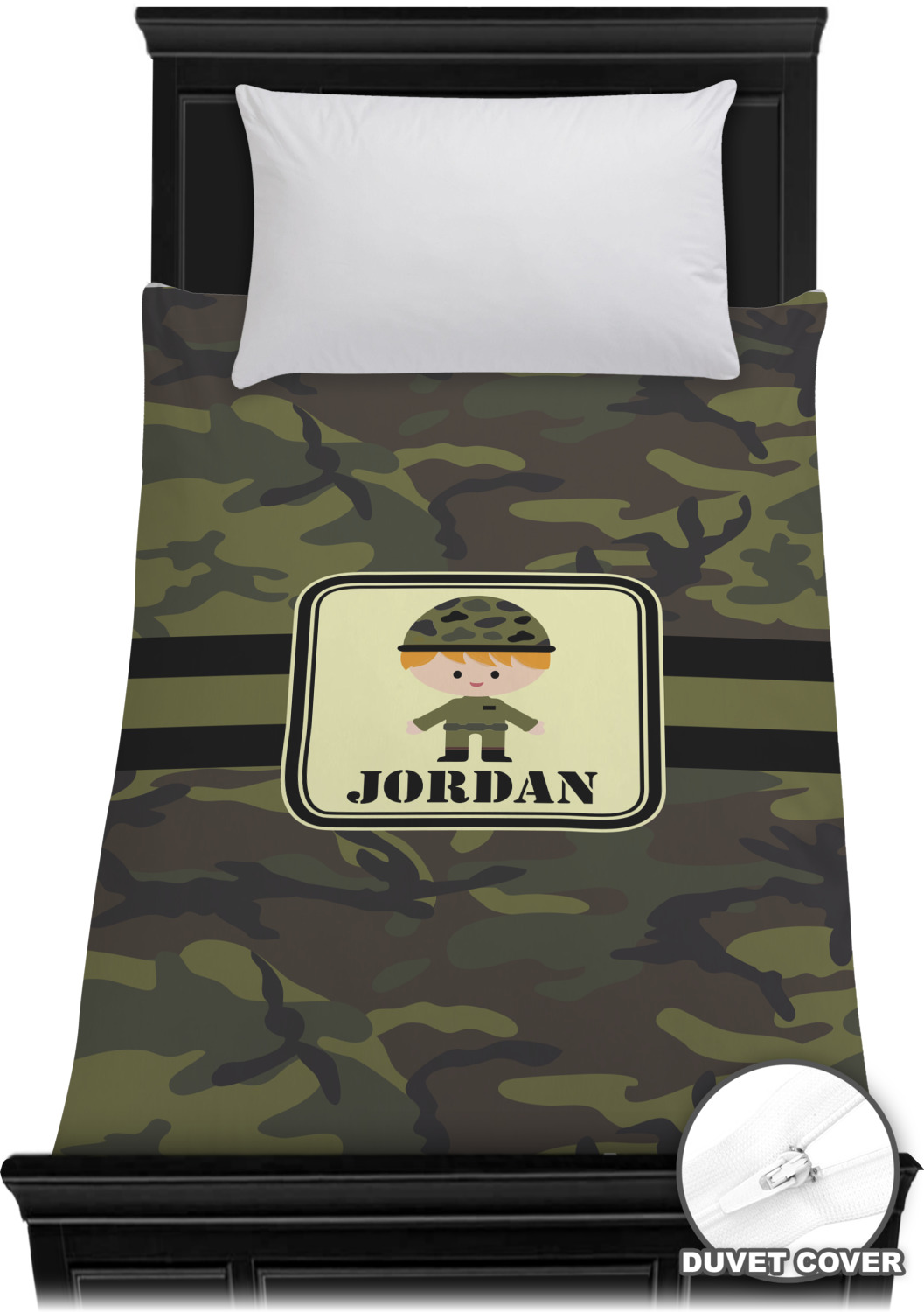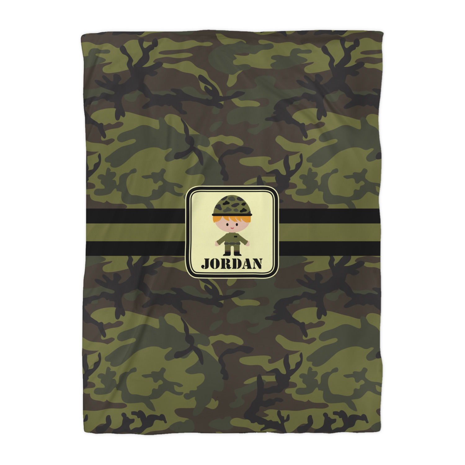 A wide band using coordinating colors runs down the middle of this design. A square label, outlined with camo colors, showcases our little military man with added personalization for the special touch.