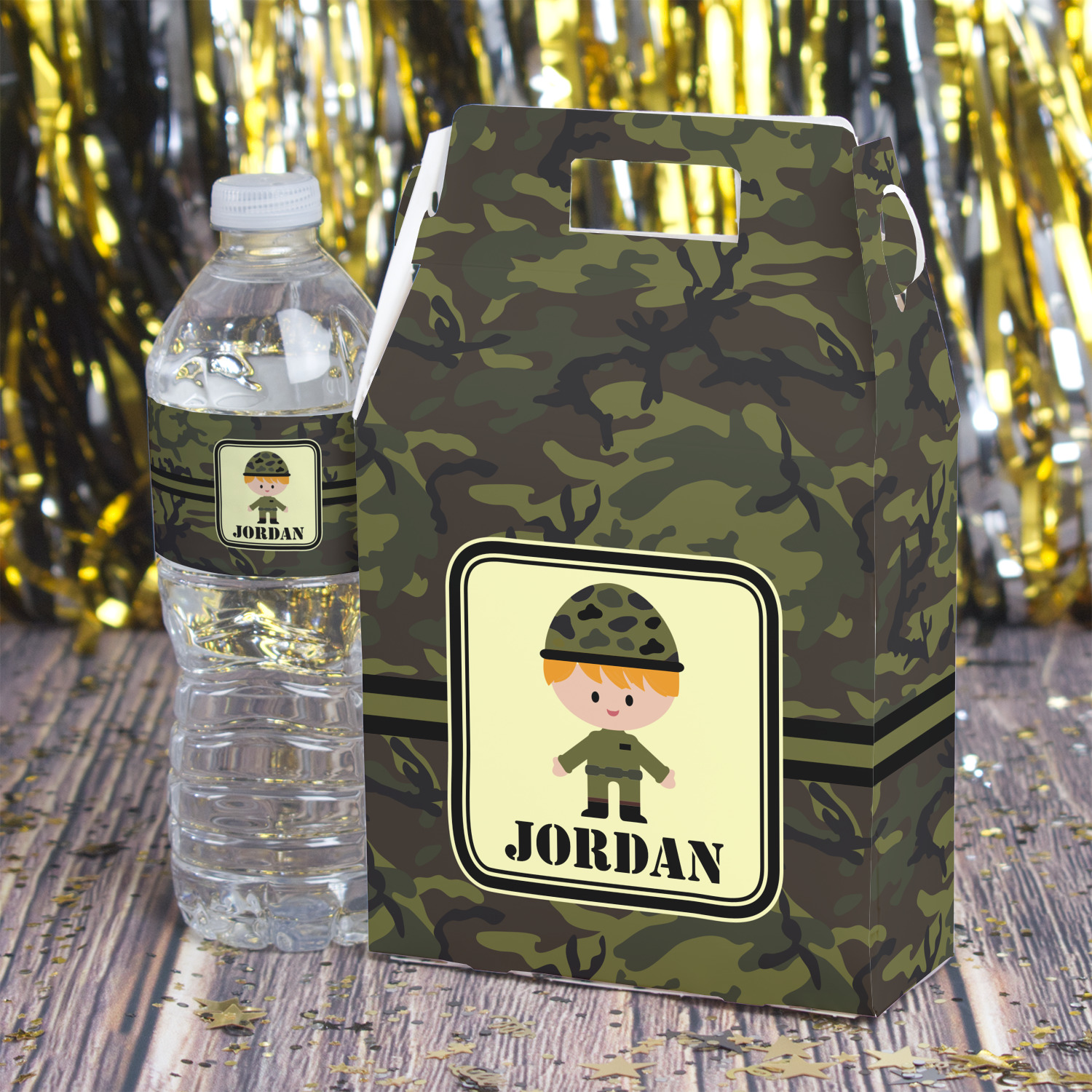 A wide band using coordinating colors runs down the middle of this design. A square label, outlined with camo colors, showcases our little military man with added personalization for the special touch.