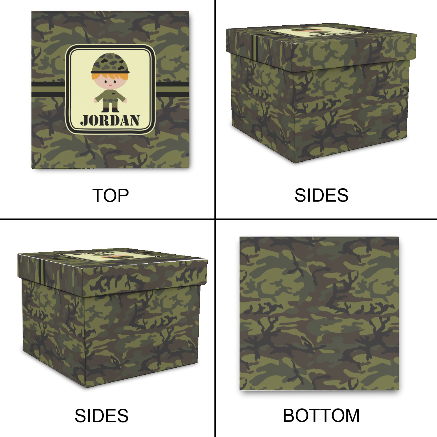A wide band using coordinating colors runs down the middle of this design. A square label, outlined with camo colors, showcases our little military man with added personalization for the special touch.