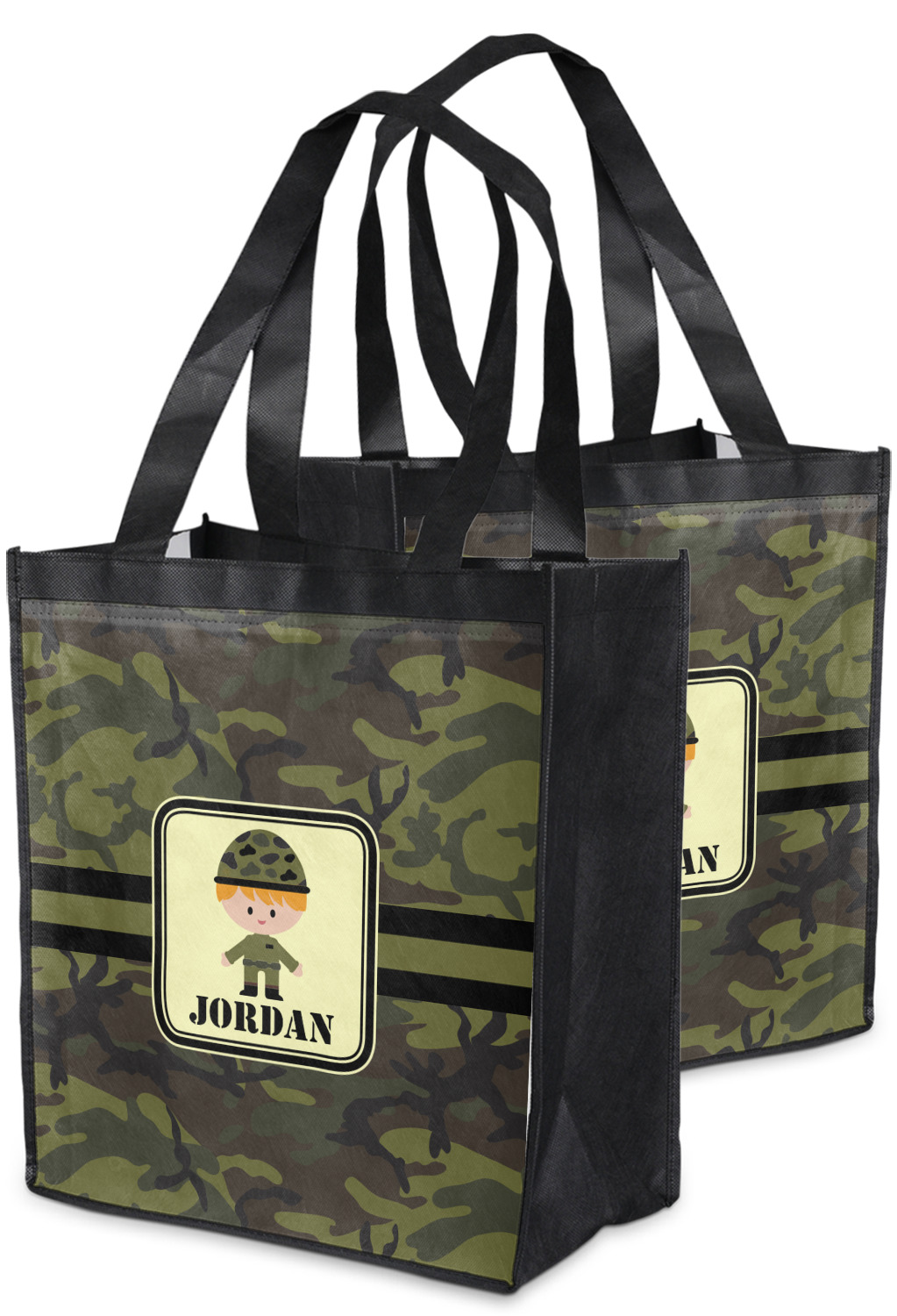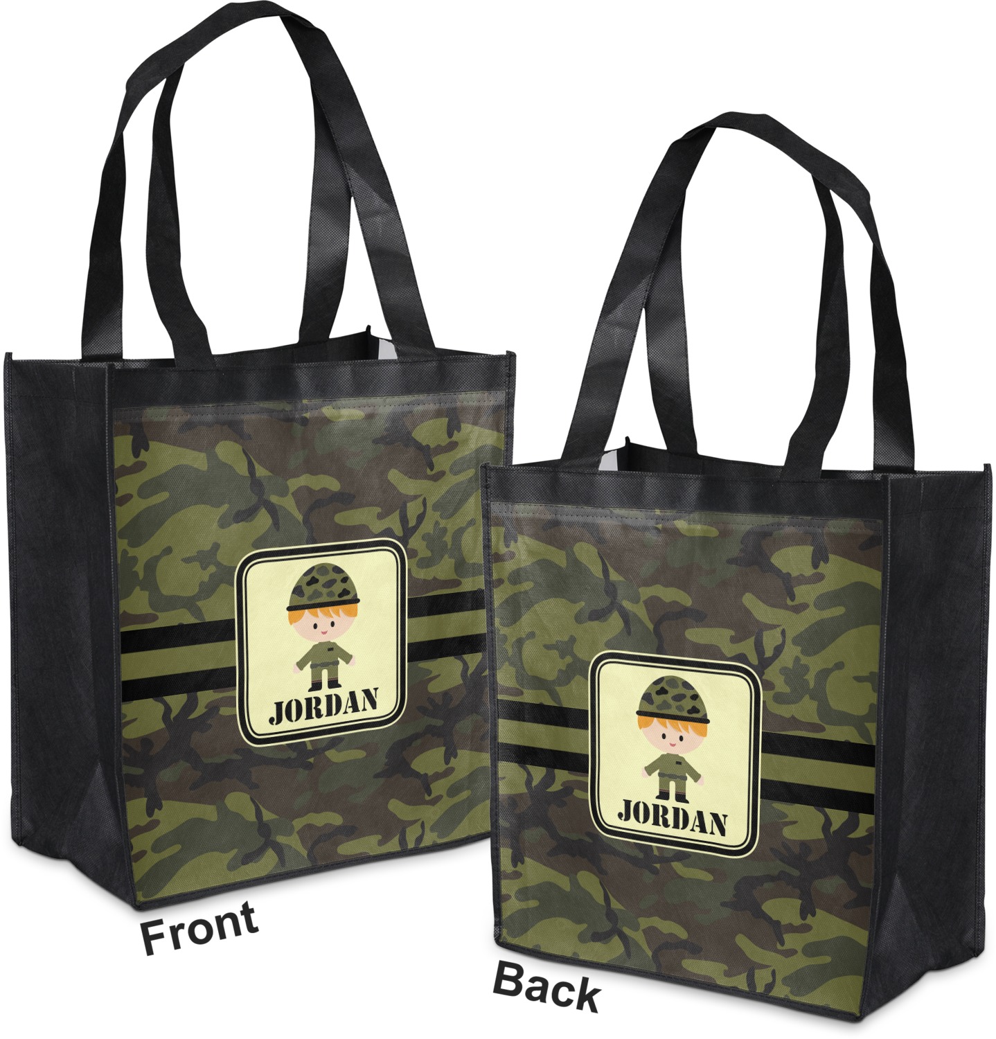 A wide band using coordinating colors runs down the middle of this design. A square label, outlined with camo colors, showcases our little military man with added personalization for the special touch.