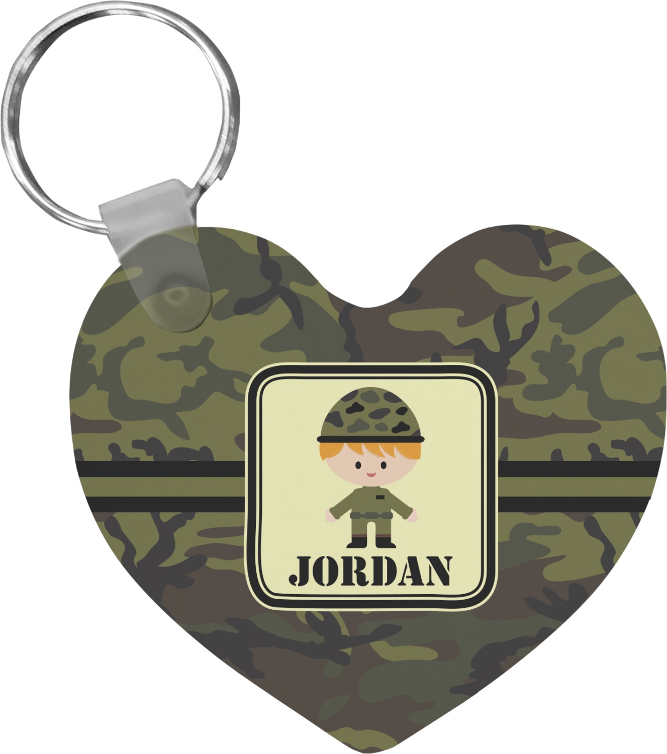 A wide band using coordinating colors runs down the middle of this design. A square label, outlined with camo colors, showcases our little military man with added personalization for the special touch.