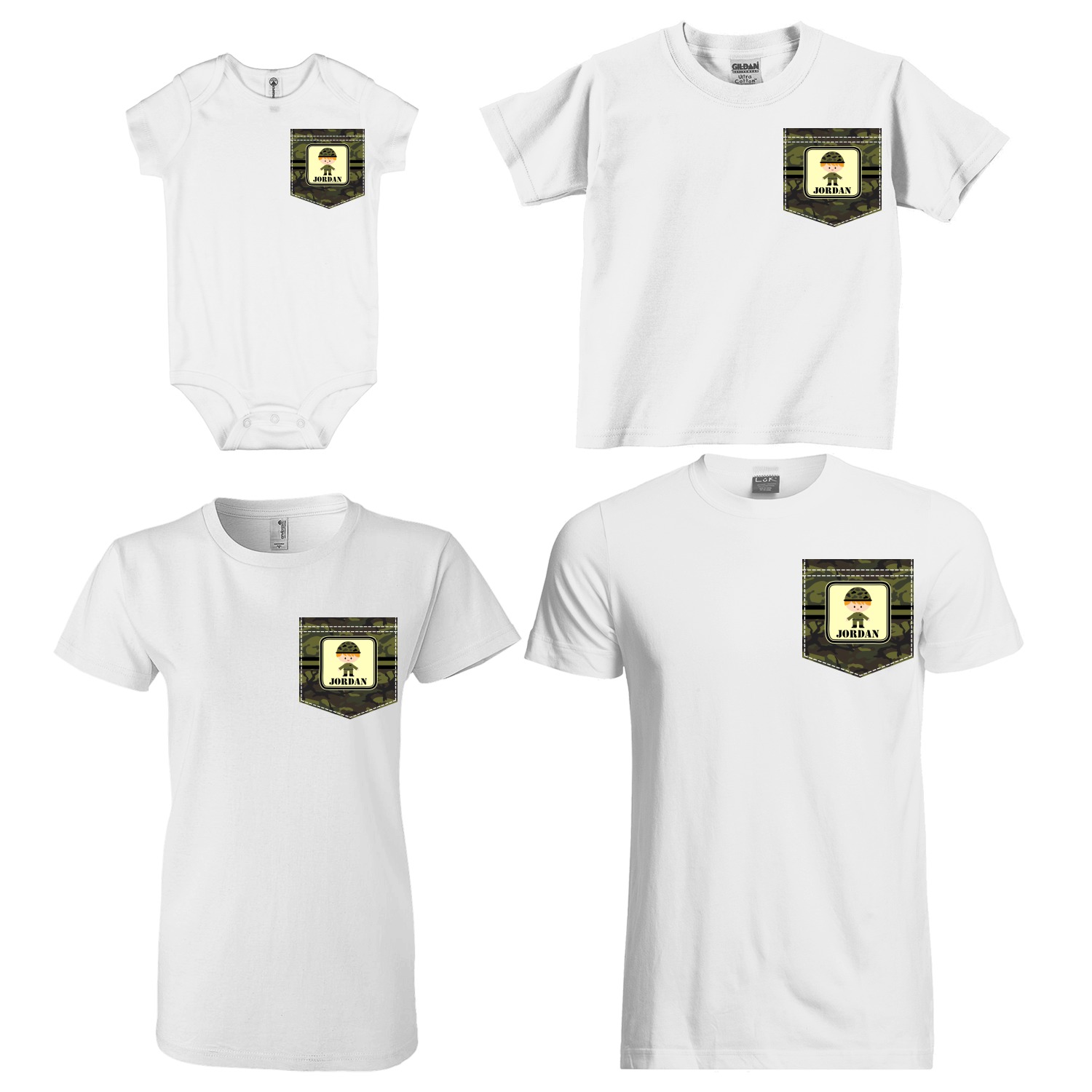 The faux pockets are available in 4 different sizes - for baby, kids, youth/women & men; the whole family can have the same pocket design, but sized just for them! The pockets are printed using our direct-to-film technology to the exact shape & size. We have faux stitching around the pocket, with double stitching on the top of the pocket to give it the authentic pocket look!