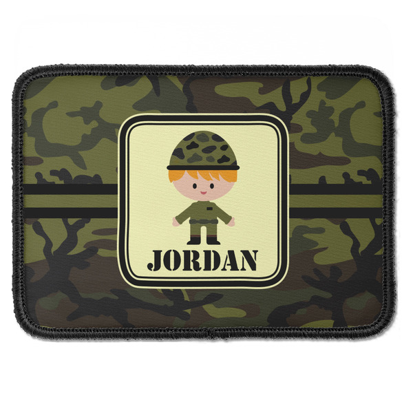 A wide band using coordinating colors runs down the middle of this design. A square label, outlined with camo colors, showcases our little military man with added personalization for the special touch.