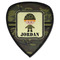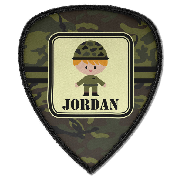 A wide band using coordinating colors runs down the middle of this design. A square label, outlined with camo colors, showcases our little military man with added personalization for the special touch.