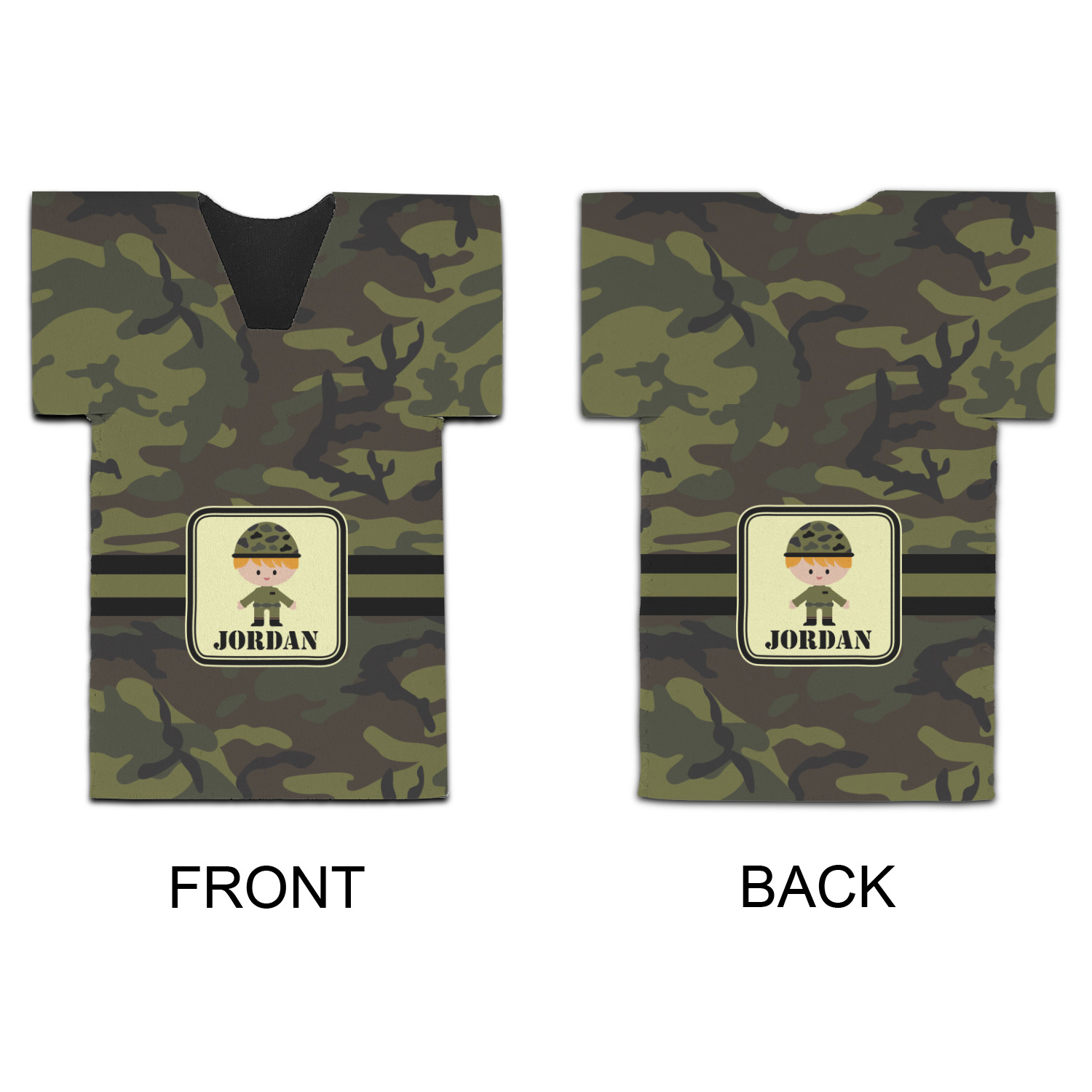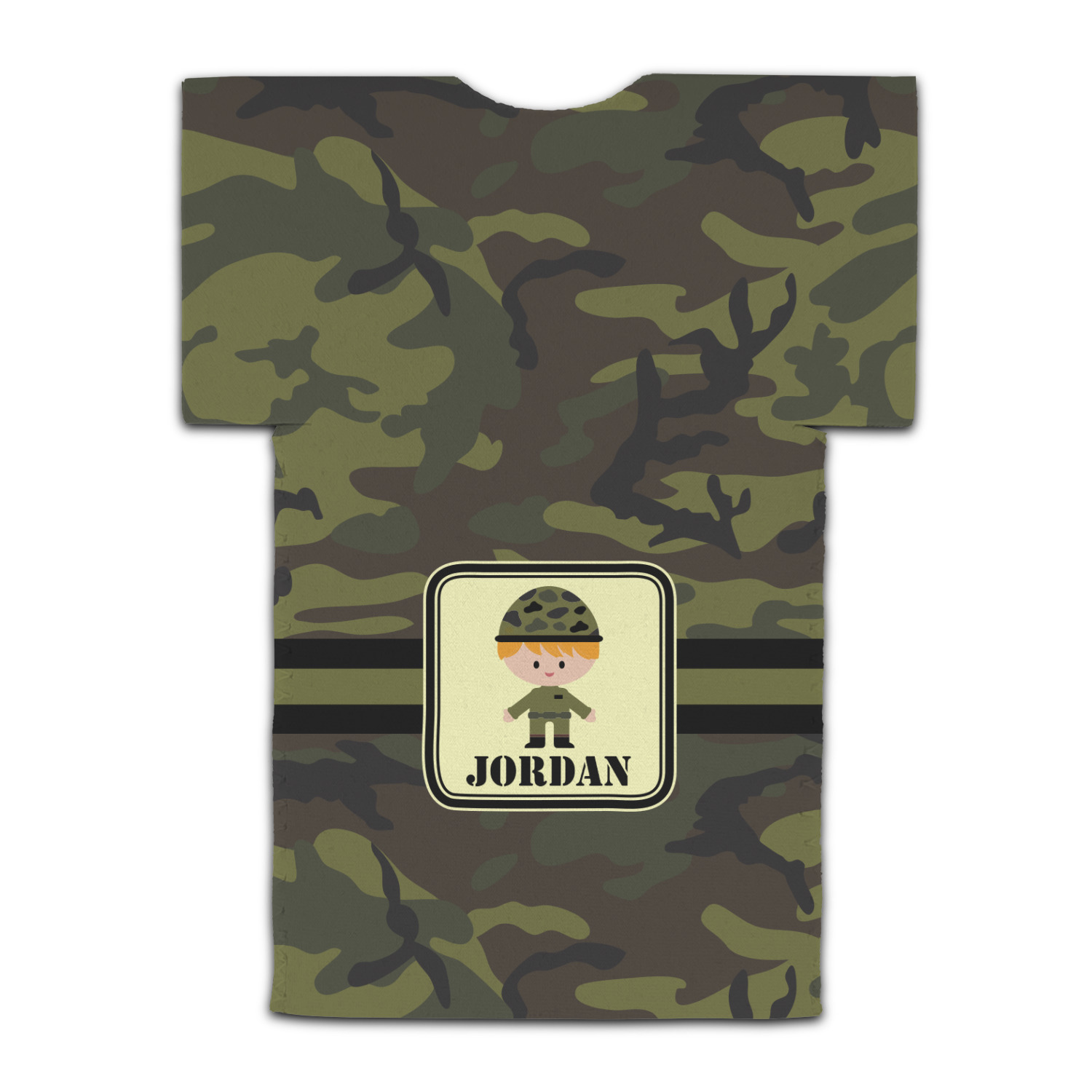 A wide band using coordinating colors runs down the middle of this design. A square label, outlined with camo colors, showcases our little military man with added personalization for the special touch.
