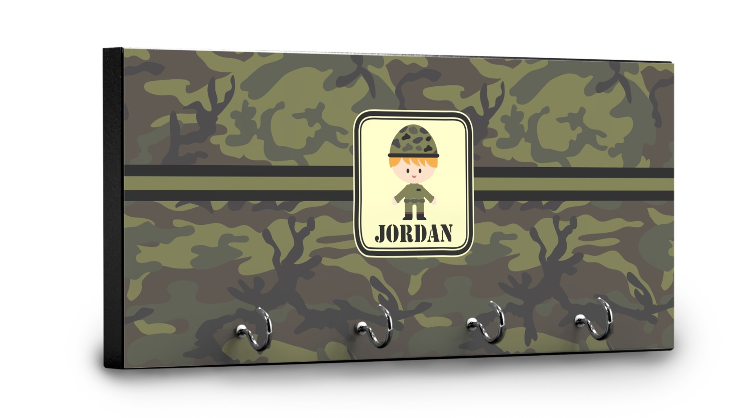 A wide band using coordinating colors runs down the middle of this design. A square label, outlined with camo colors, showcases our little military man with added personalization for the special touch.