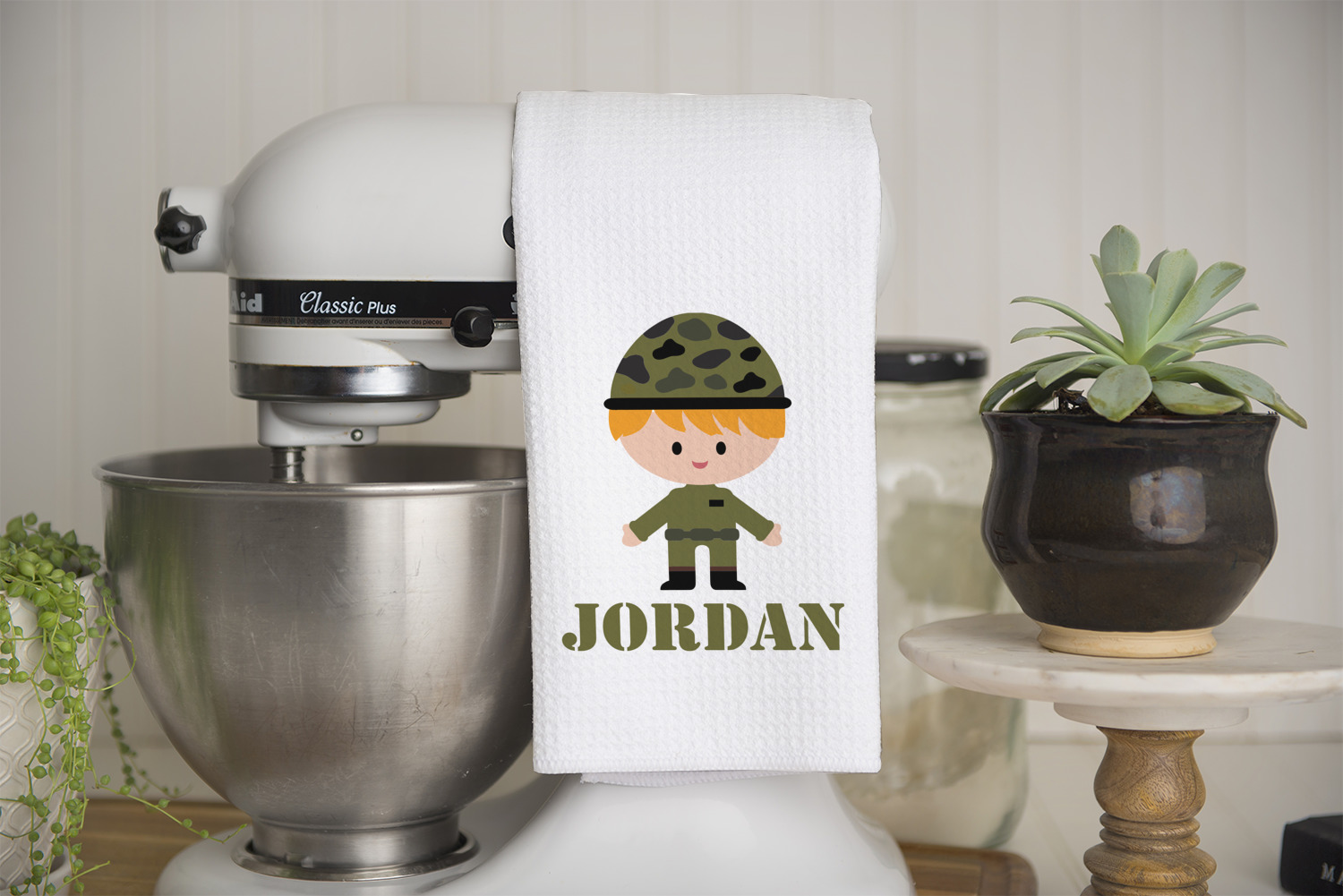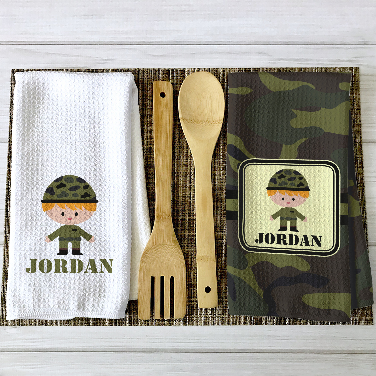 A wide band using coordinating colors runs down the middle of this design. A square label, outlined with camo colors, showcases our little military man with added personalization for the special touch.