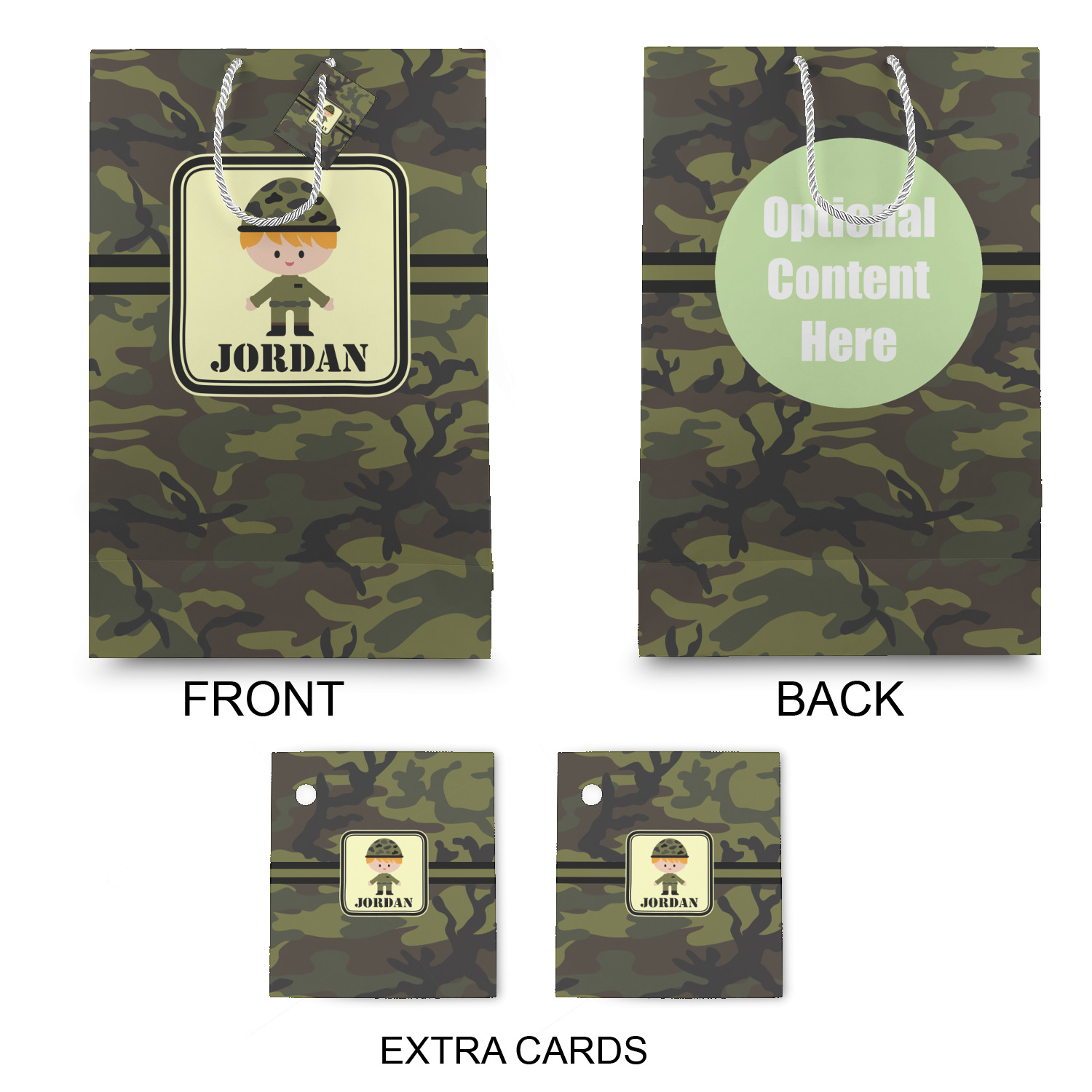 A wide band using coordinating colors runs down the middle of this design. A square label, outlined with camo colors, showcases our little military man with added personalization for the special touch.