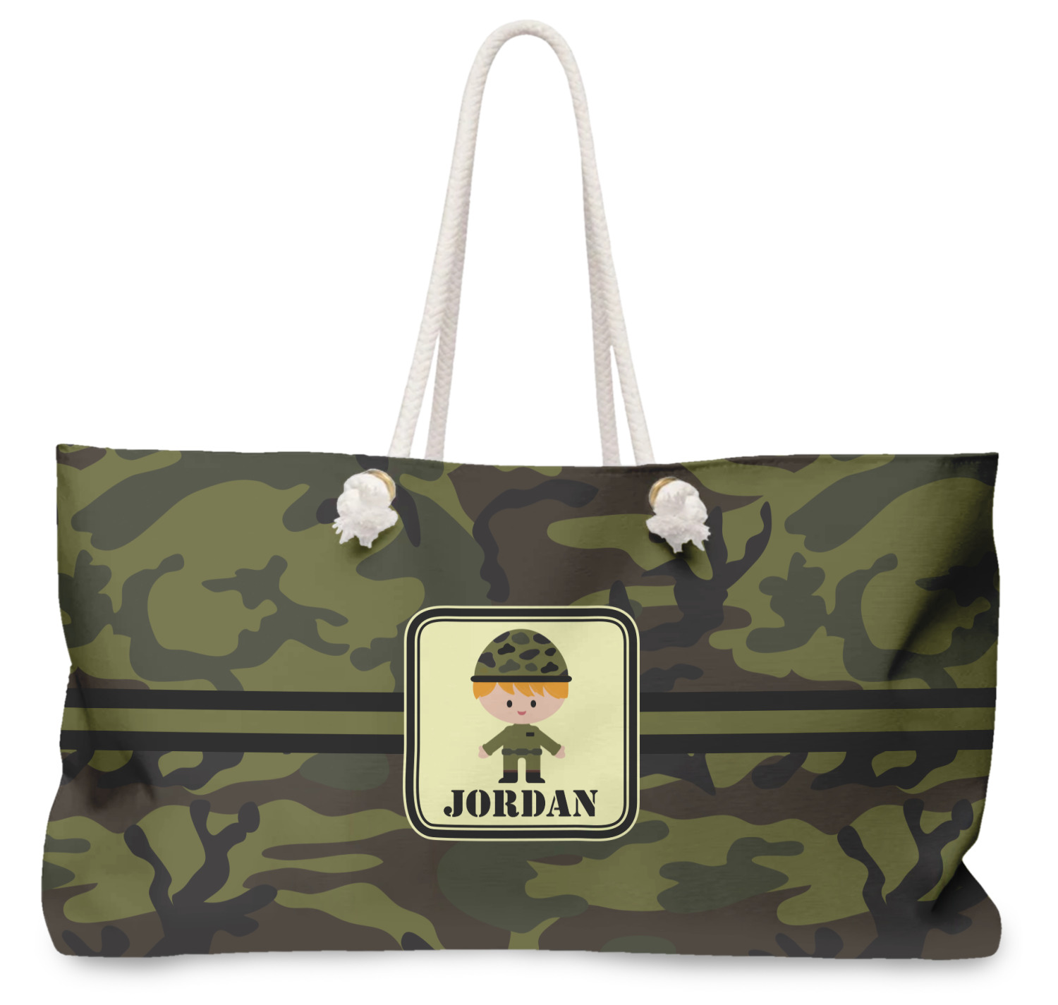 A wide band using coordinating colors runs down the middle of this design. A square label, outlined with camo colors, showcases our little military man with added personalization for the special touch.