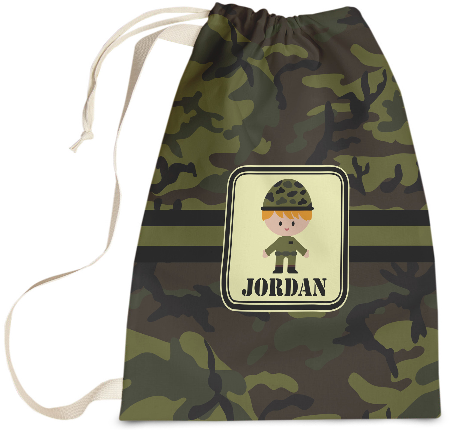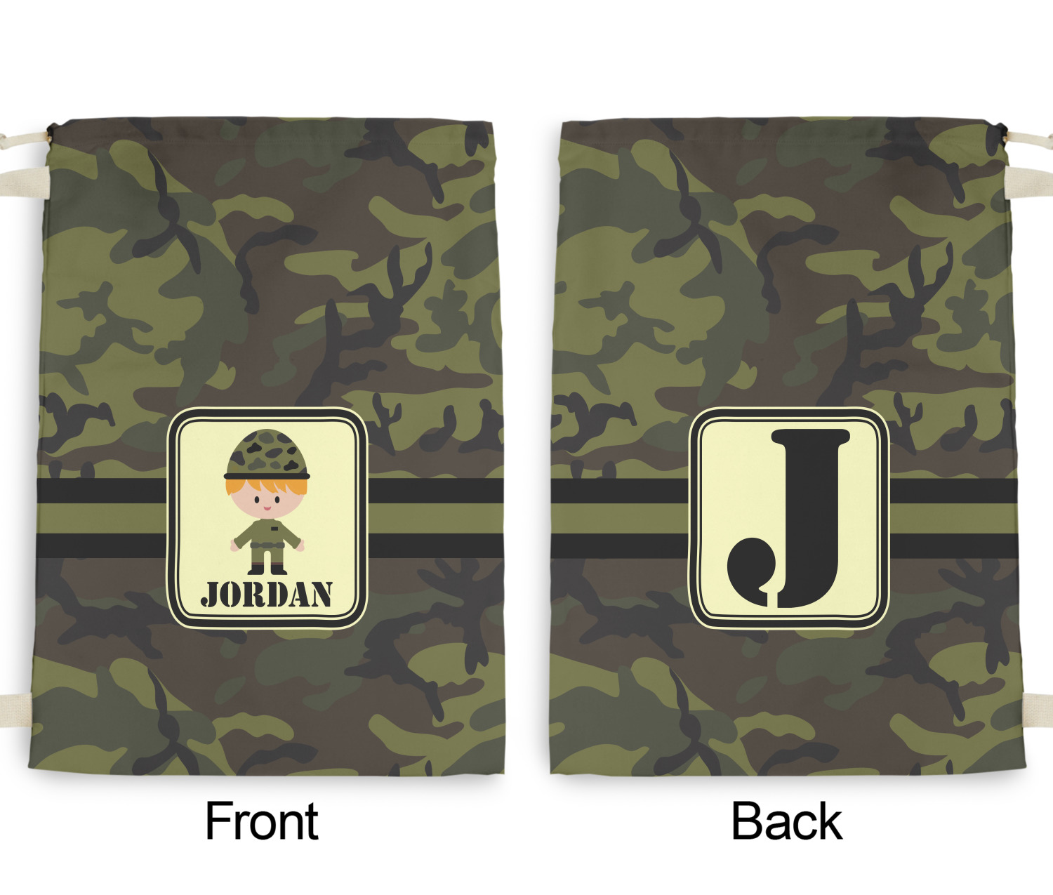 A wide band using coordinating colors runs down the middle of this design. A square label, outlined with camo colors, showcases our little military man with added personalization for the special touch.