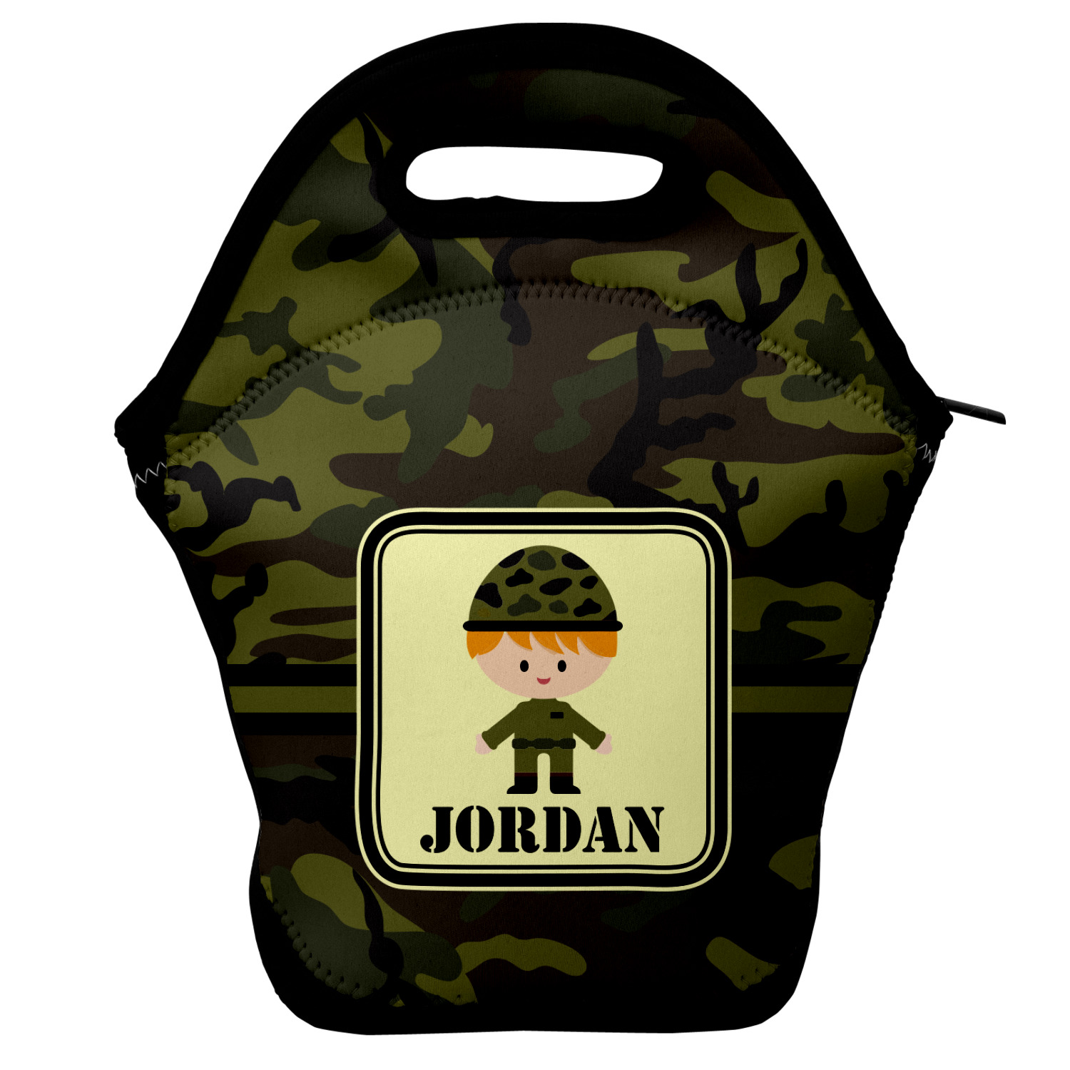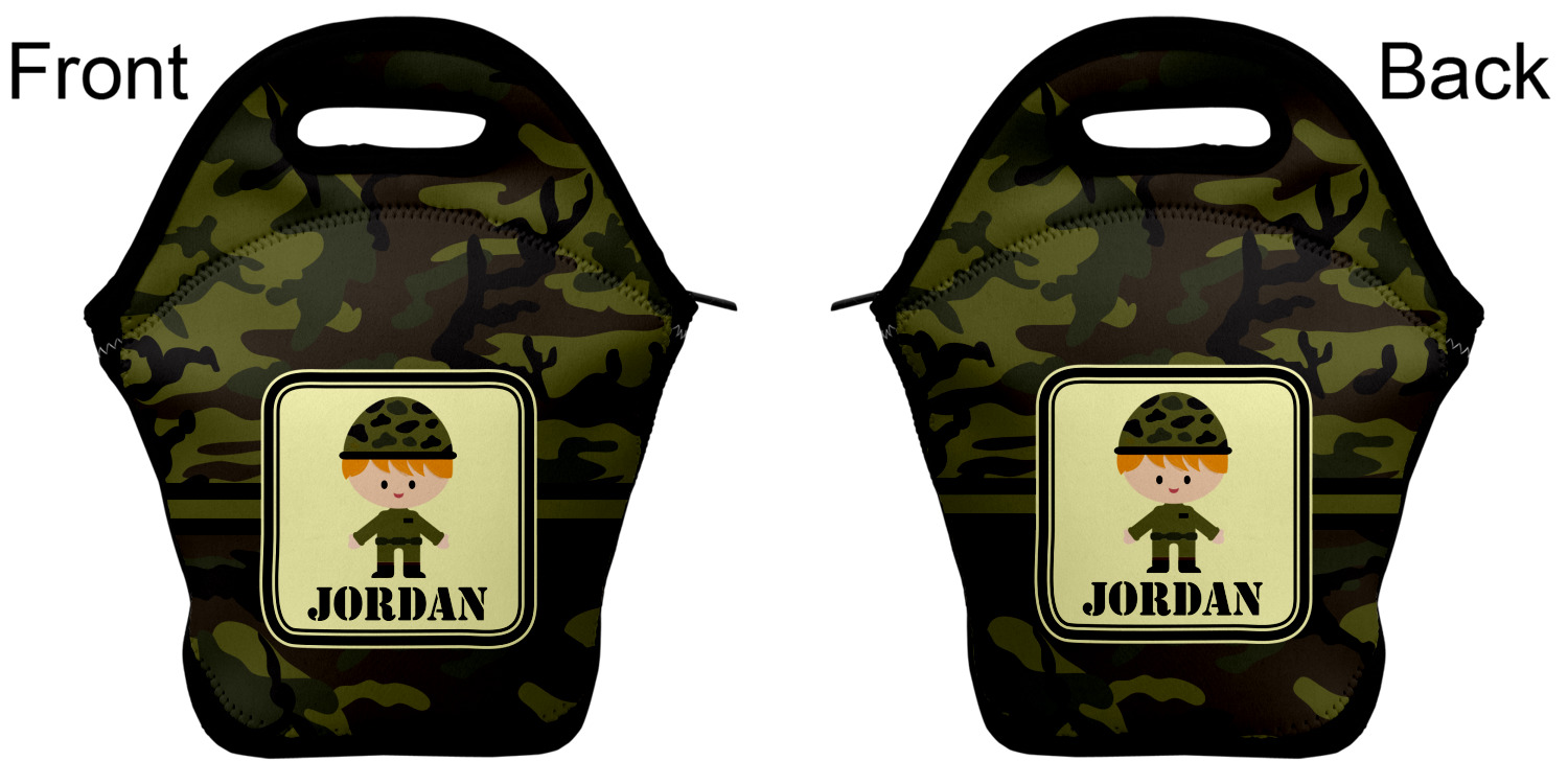 Our personalized lunch bags are made from a strong neoprene, and secure with a zipper closure that lines the top of the bag.The edges of the neoprene are sewn together with a heavy duty stitch, adding to the durability of the bag. The is accompanied by a reinforced handle at its top, for the easy transport of your lunch. We display your personalization across both the front and back of this neoprene lunch bag, while the remaining sides are a sleek black in color. Each bag measures at 13.5 inches tall, and 11.5 inches wide.