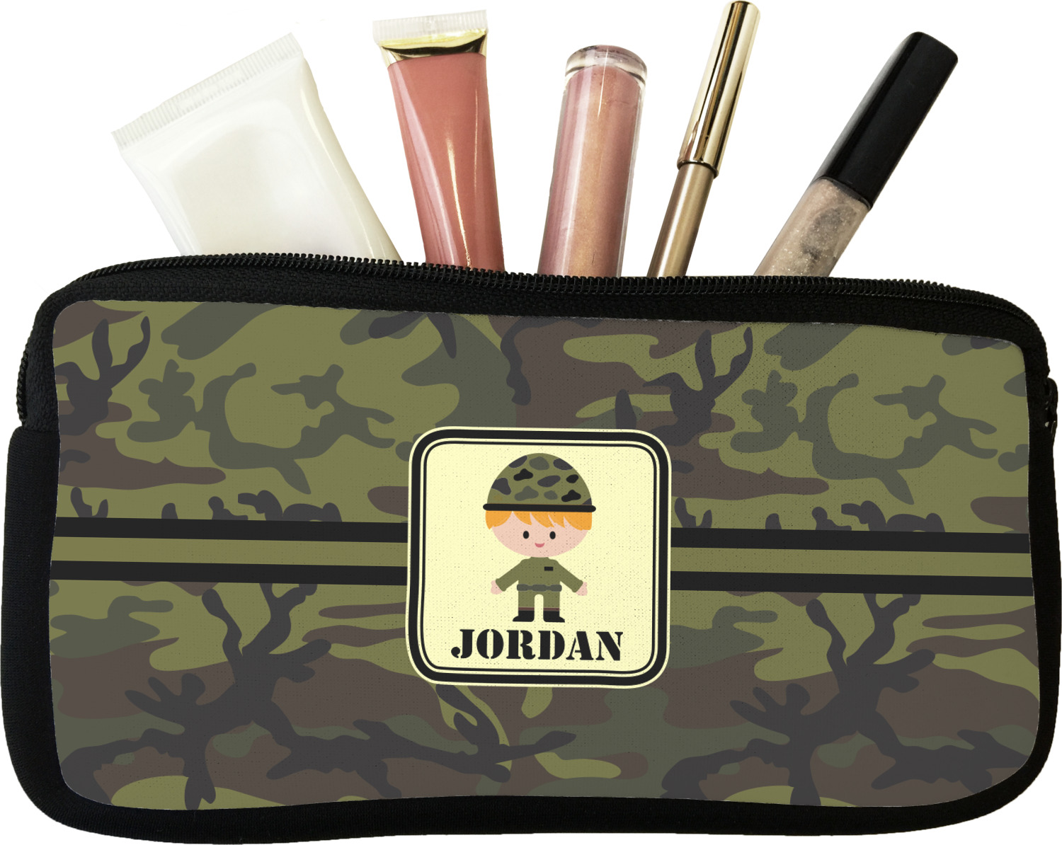 Our personalized makeup bags are available in many different designs, patterns and colors - so you are sure to find one that will love. They are made of neoprene (same material as wet-suits) and thus are water resistant, so spillages in your makeup bag will not end up all over you purse. They are customized on one side and are black on the other side and the zipper is black as well.