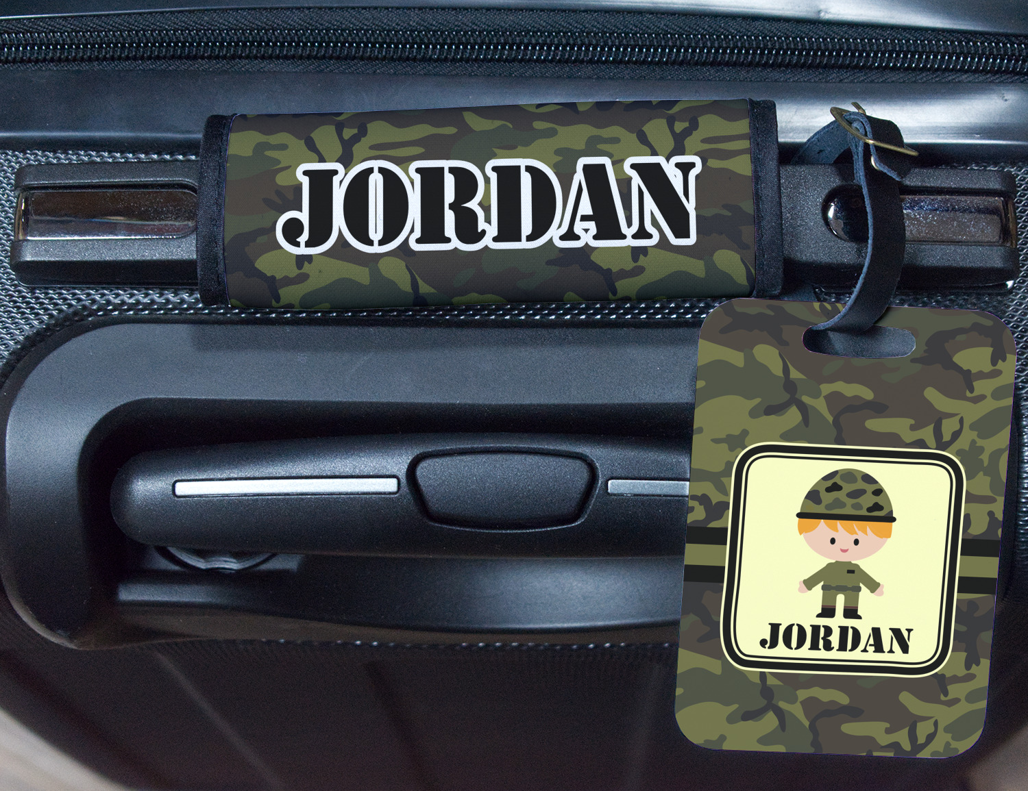A wide band using coordinating colors runs down the middle of this design. A square label, outlined with camo colors, showcases our little military man with added personalization for the special touch.