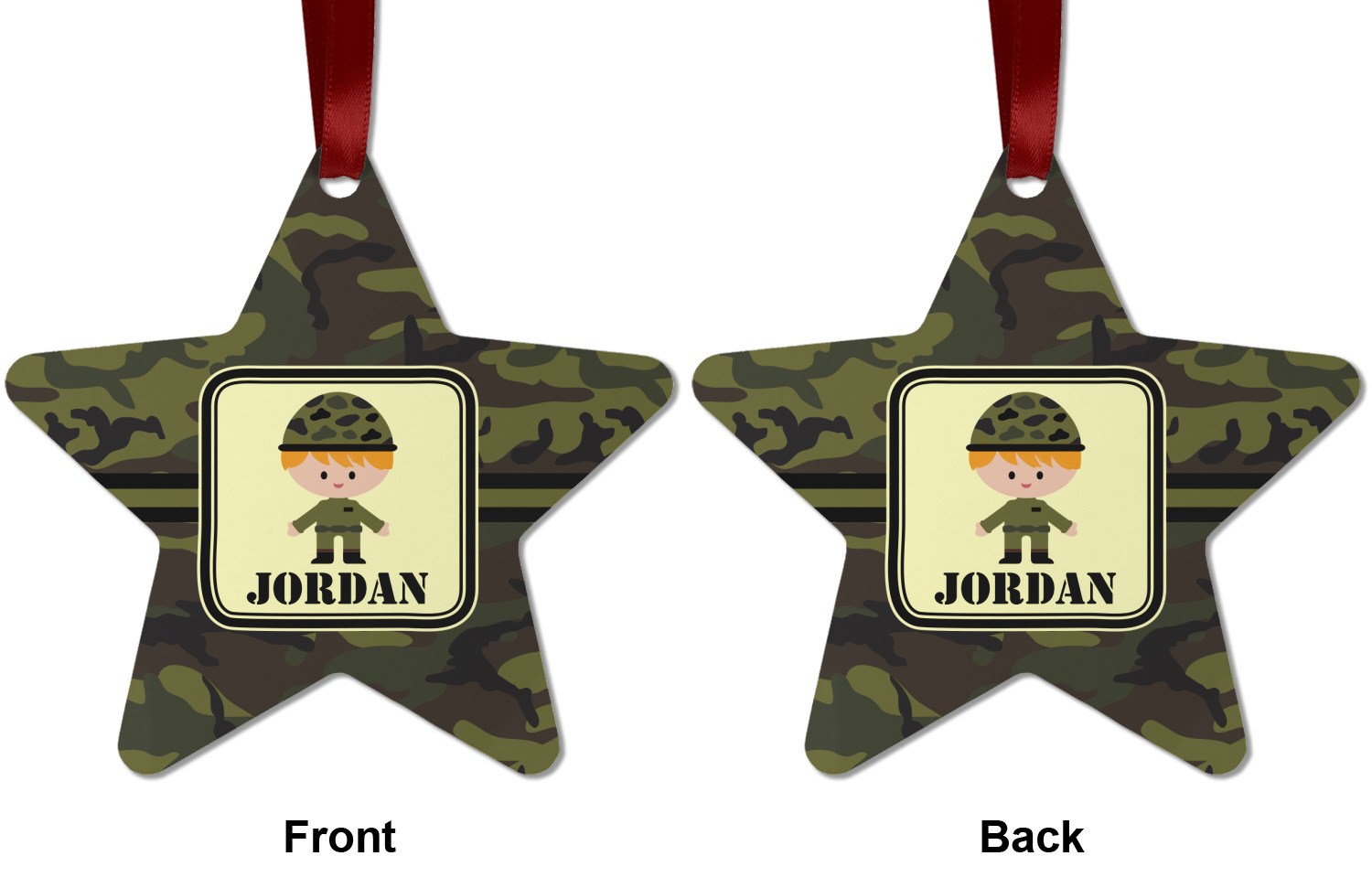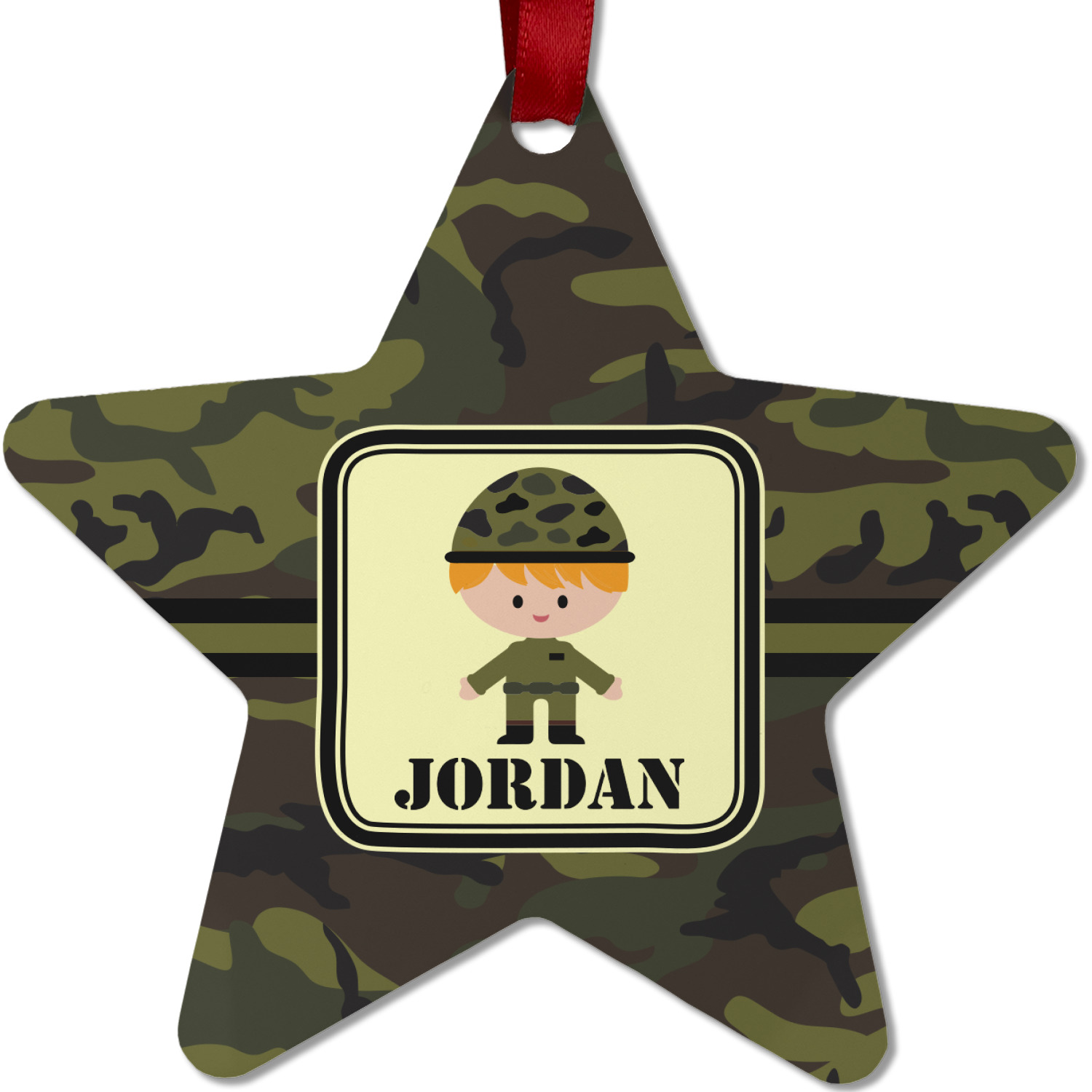 A wide band using coordinating colors runs down the middle of this design. A square label, outlined with camo colors, showcases our little military man with added personalization for the special touch.