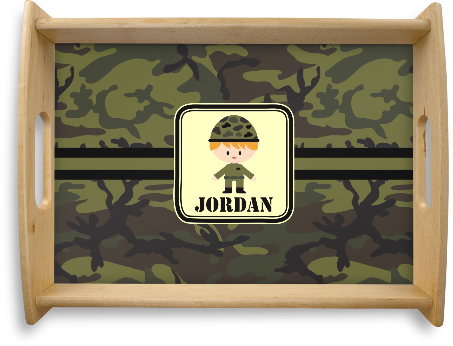 A wide band using coordinating colors runs down the middle of this design. A square label, outlined with camo colors, showcases our little military man with added personalization for the special touch.