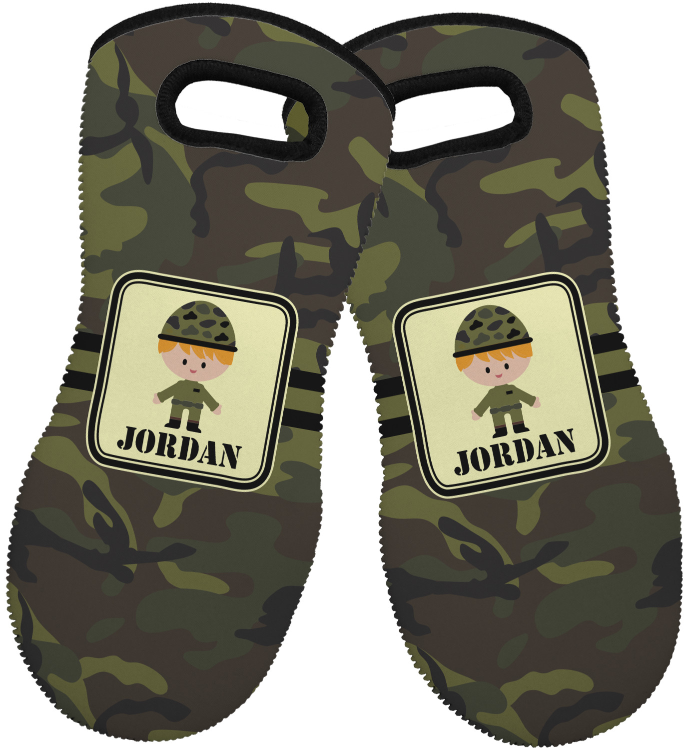 A wide band using coordinating colors runs down the middle of this design. A square label, outlined with camo colors, showcases our little military man with added personalization for the special touch.