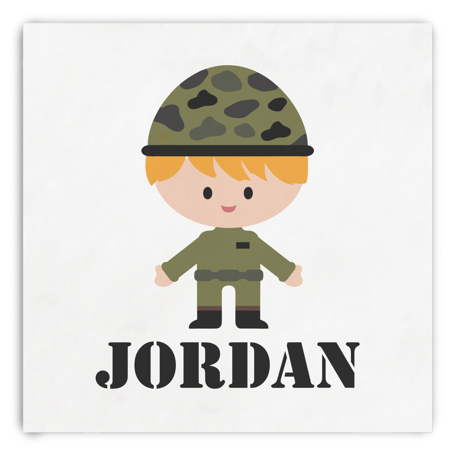 A wide band using coordinating colors runs down the middle of this design. A square label, outlined with camo colors, showcases our little military man with added personalization for the special touch.