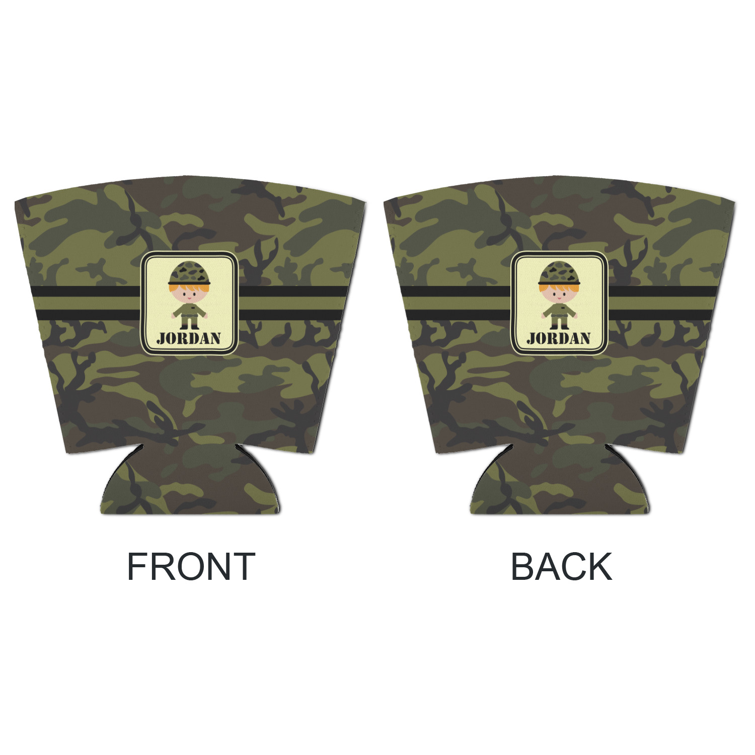 A wide band using coordinating colors runs down the middle of this design. A square label, outlined with camo colors, showcases our little military man with added personalization for the special touch.