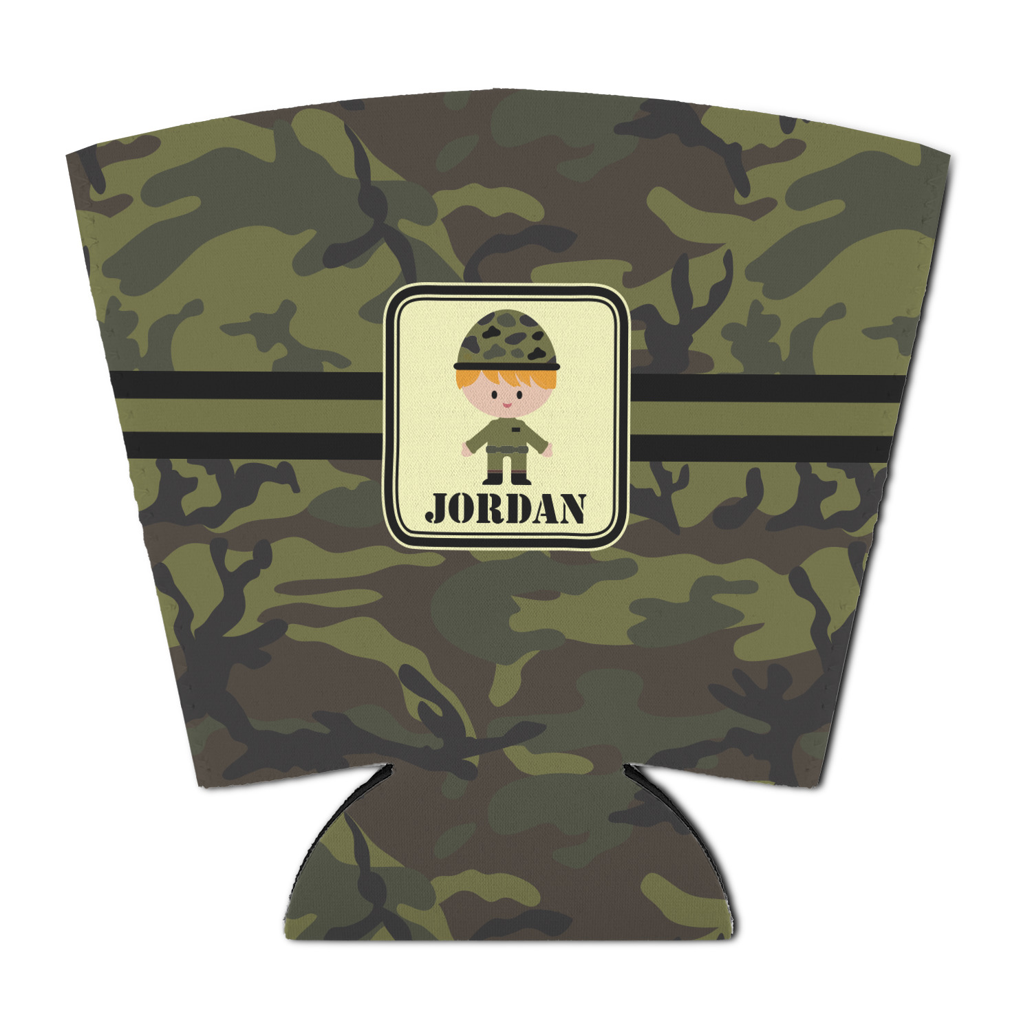 A wide band using coordinating colors runs down the middle of this design. A square label, outlined with camo colors, showcases our little military man with added personalization for the special touch.