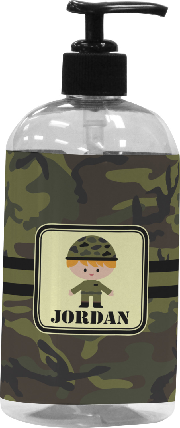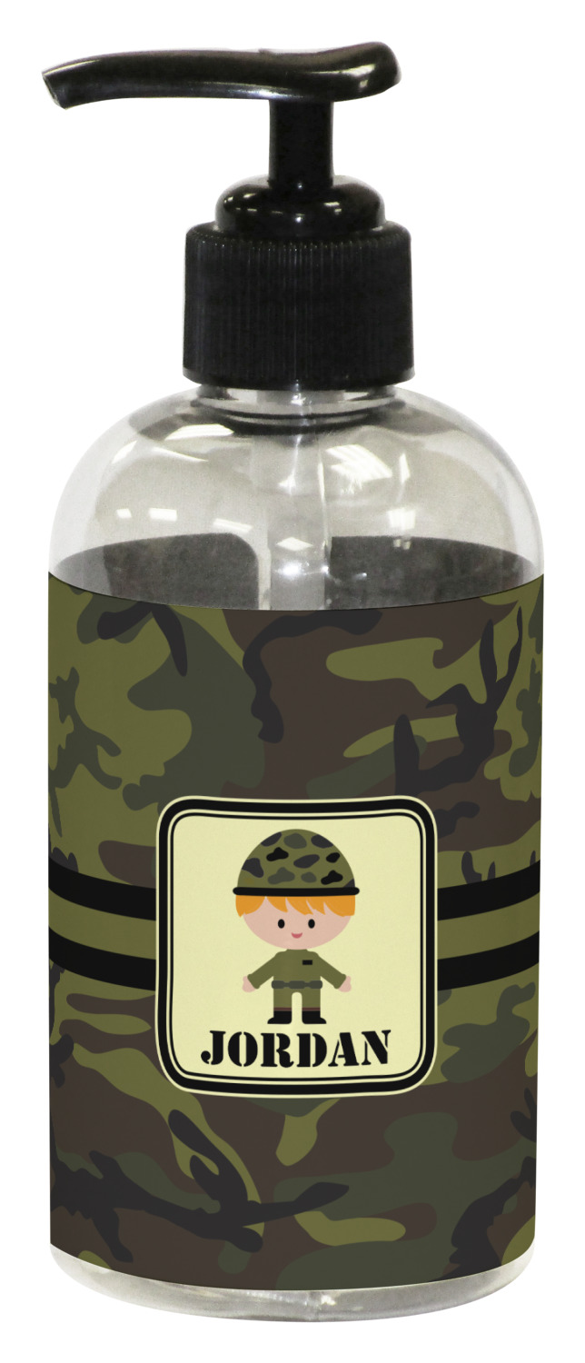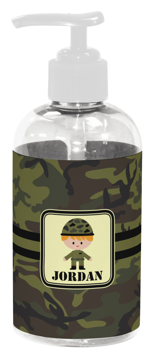 A wide band using coordinating colors runs down the middle of this design. A square label, outlined with camo colors, showcases our little military man with added personalization for the special touch.