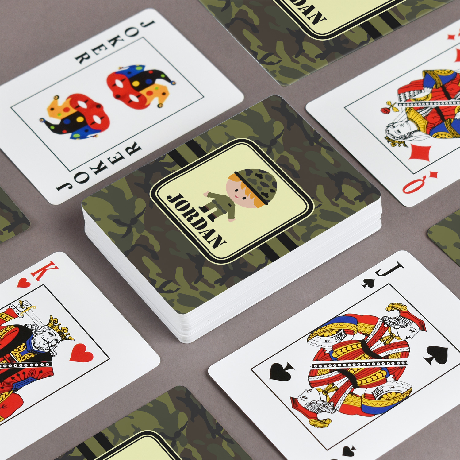 The customization / personalization is printed on the back side. The playing cards have a low gloss coating on both sides. The cards are packaged in a clear plastic box.