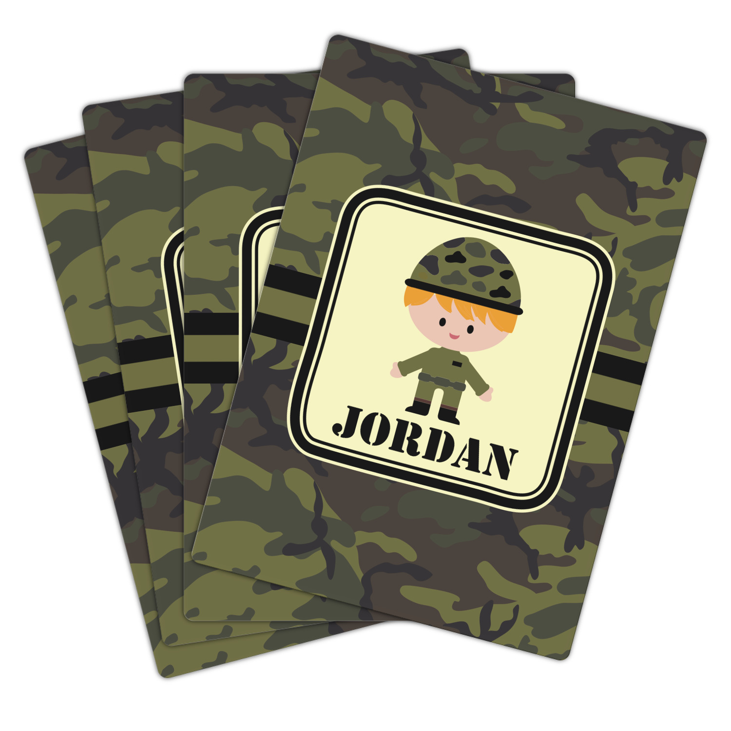 A wide band using coordinating colors runs down the middle of this design. A square label, outlined with camo colors, showcases our little military man with added personalization for the special touch.