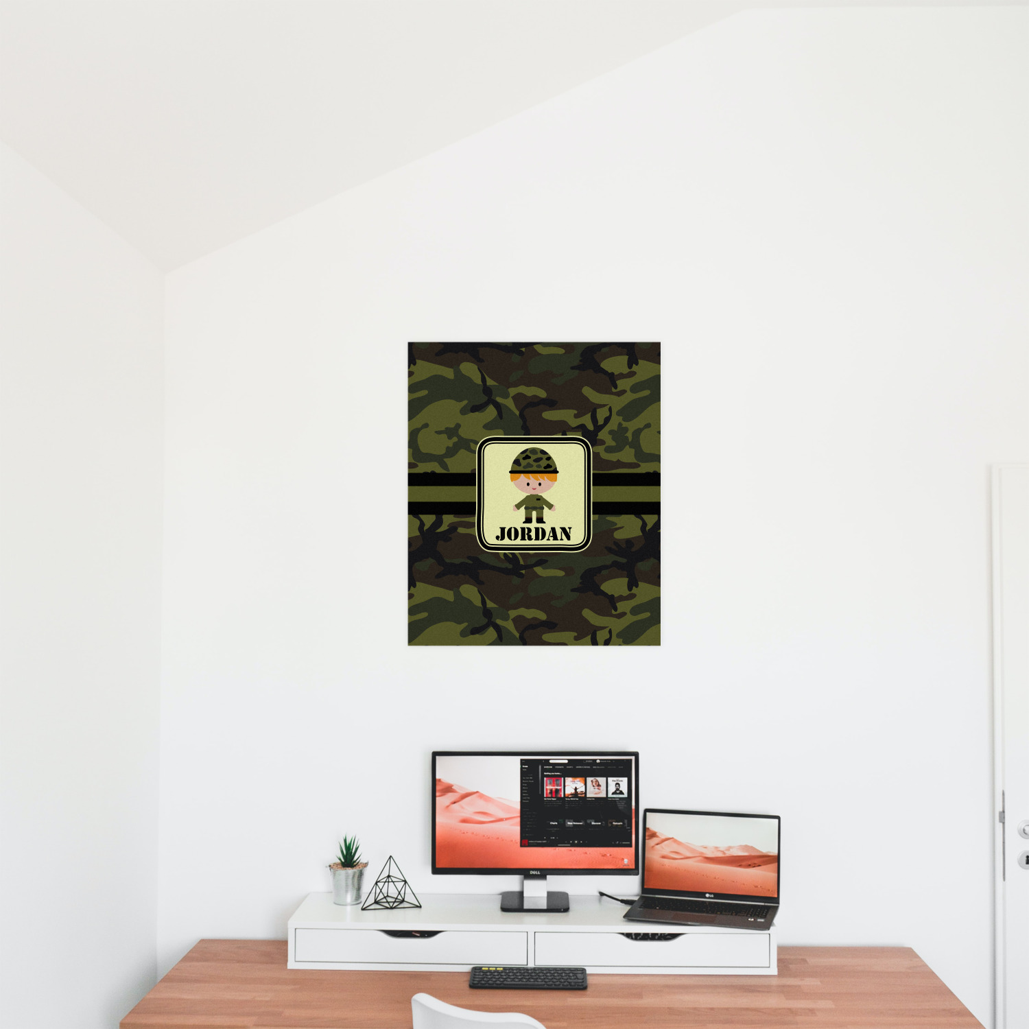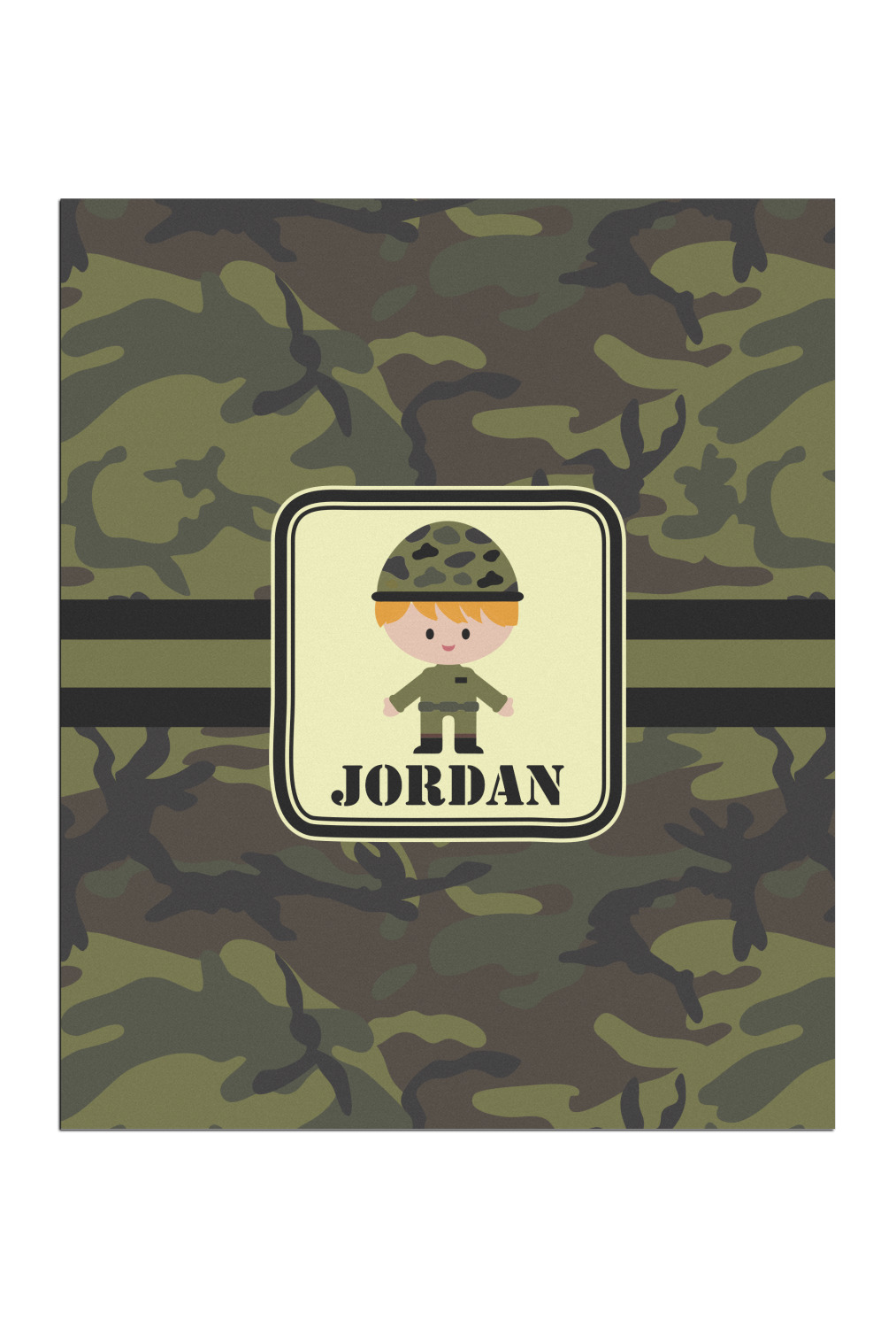 A wide band using coordinating colors runs down the middle of this design. A square label, outlined with camo colors, showcases our little military man with added personalization for the special touch.