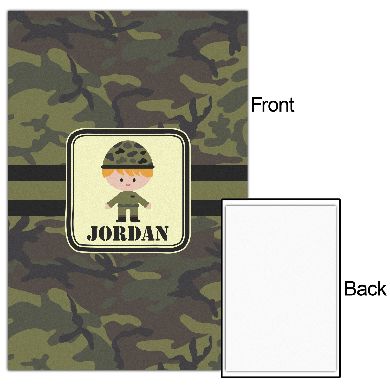 A wide band using coordinating colors runs down the middle of this design. A square label, outlined with camo colors, showcases our little military man with added personalization for the special touch.