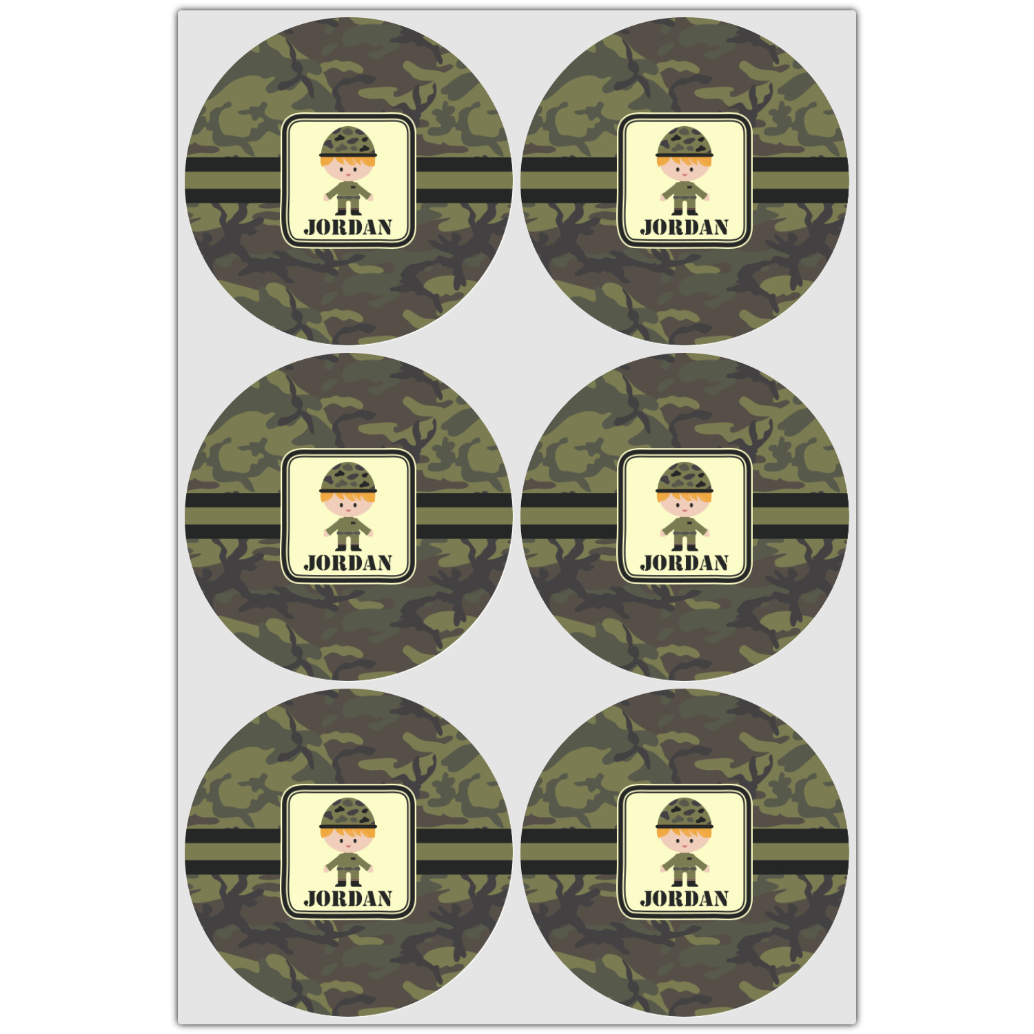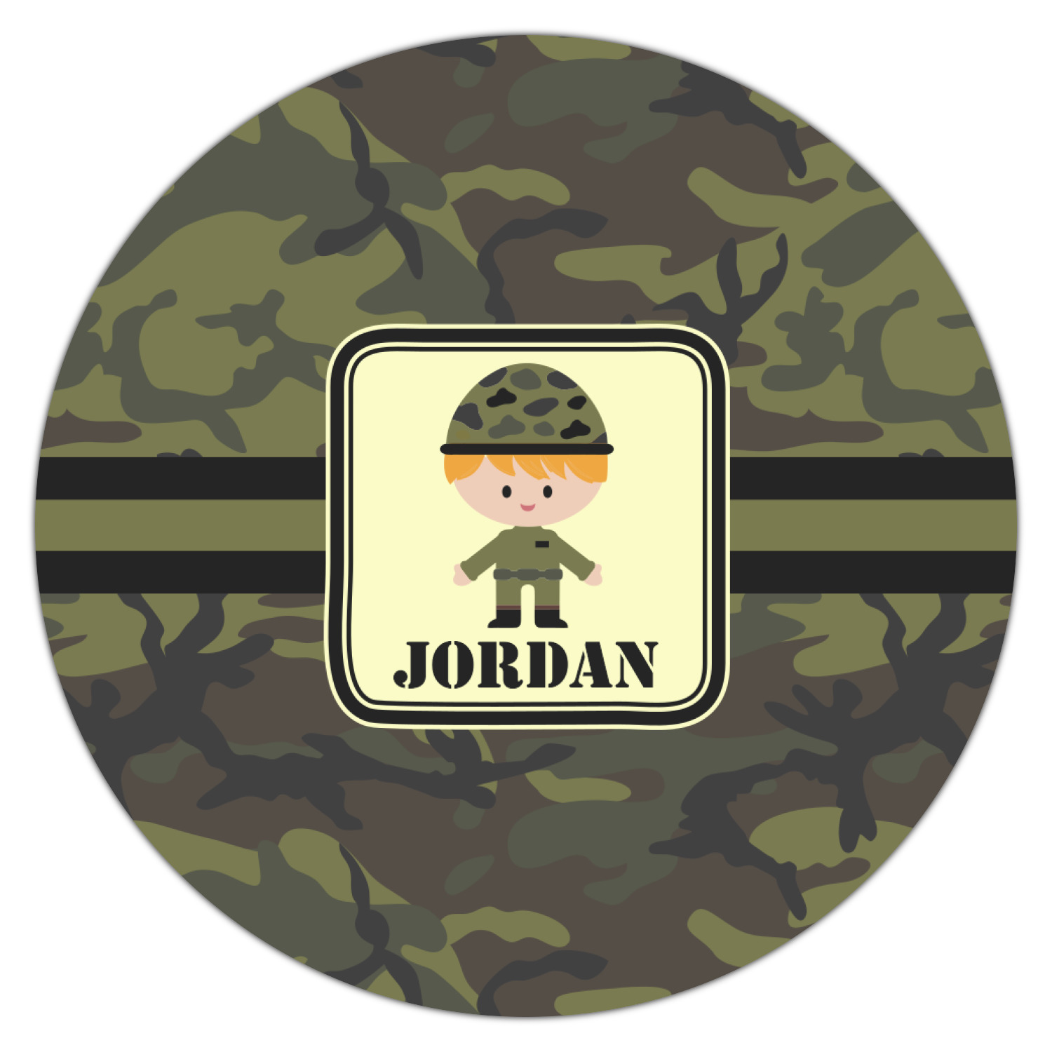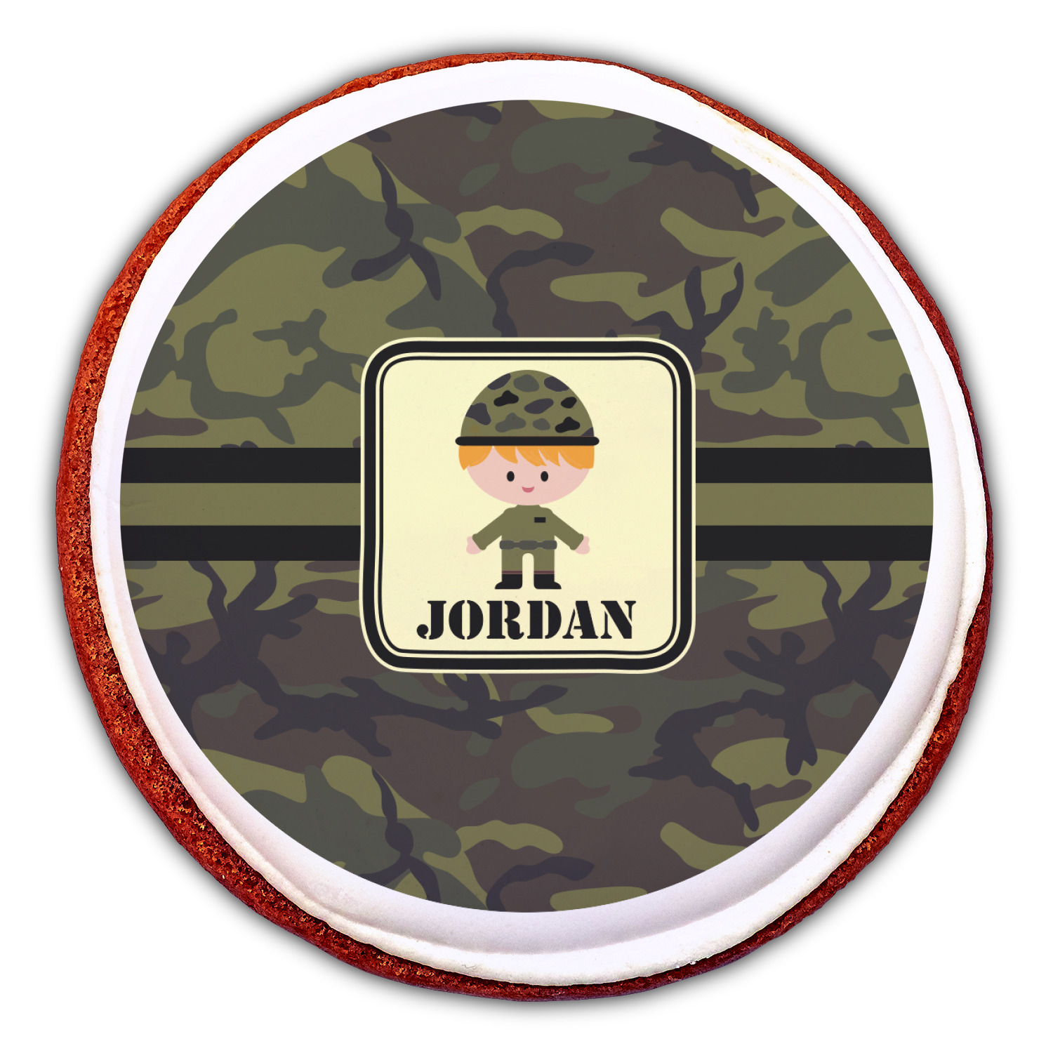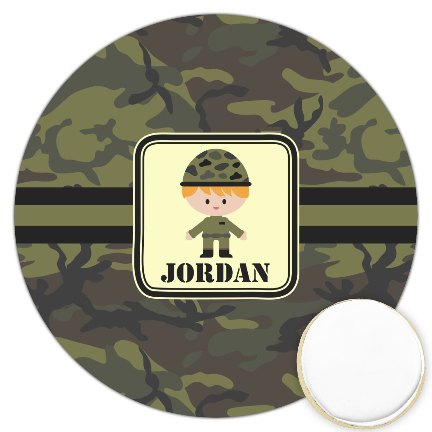 A wide band using coordinating colors runs down the middle of this design. A square label, outlined with camo colors, showcases our little military man with added personalization for the special touch.