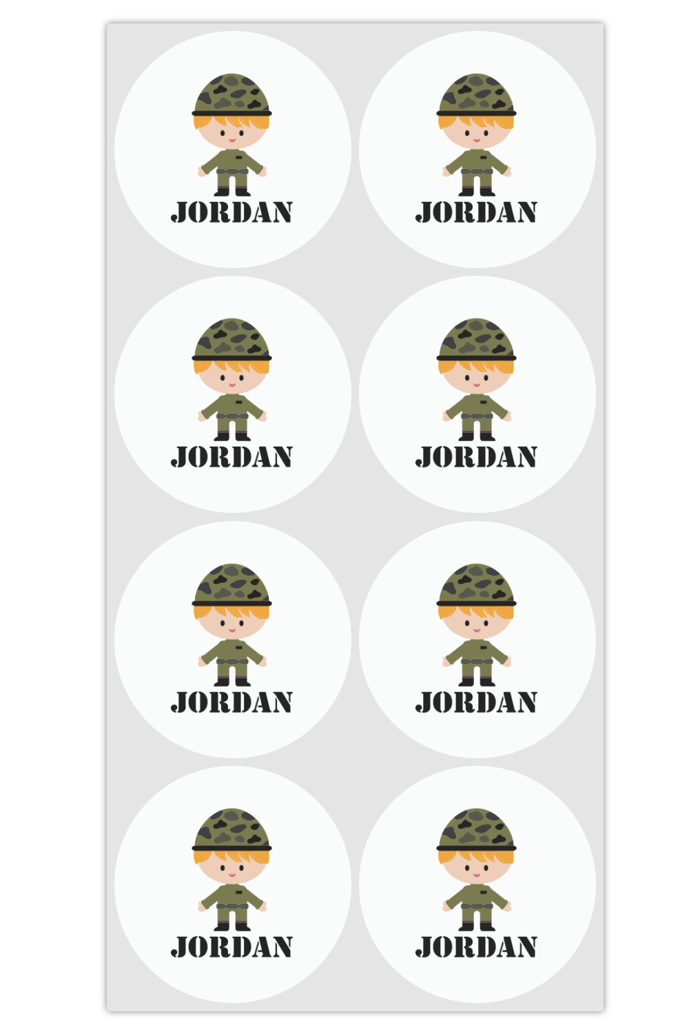 A wide band using coordinating colors runs down the middle of this design. A square label, outlined with camo colors, showcases our little military man with added personalization for the special touch.
