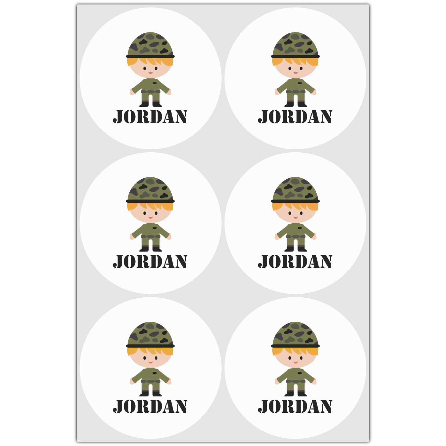 A wide band using coordinating colors runs down the middle of this design. A square label, outlined with camo colors, showcases our little military man with added personalization for the special touch.